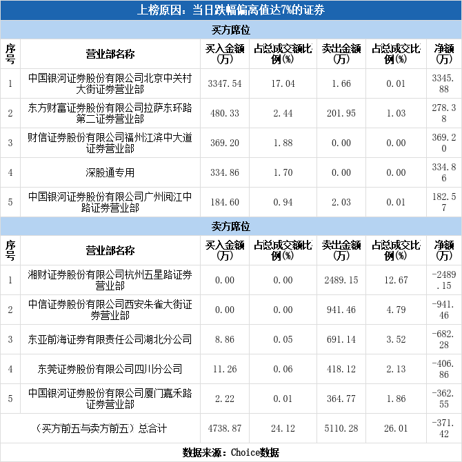 深交所2023年11月1日交易公开信息显示,启明信息因属于当日跌幅偏离值达7%的证券而登上龙虎榜。启明信息当日报收18.46元,涨跌幅为-10.00%,偏离值达-9.87%,换手率2.61%,振幅0.00%,成交额1.97亿元。 ![]() 11月1日席位详情如下: ![]() 今日龙虎榜单上出现了深股通的身影,占据了买四的位置,呈现净买入334.86万元,占当日成交总额的1.7%。除此之外深股通还参与到了精研科技、智度股份、银邦股份等7只个股中,其中4家呈现深股通净买入,获净买入最多的是精研科技,净买额为4495.06万元;3家呈现深股通净卖出,遭净卖出最高的为誉衡药业,净卖额为768.97万元。 榜单上出现了3家实力营业部的身影,分别位列买一、买二、卖二,合计买入3827.87万元,卖出1145.07万元,净额为2682.79万元。 买一为中国银河证券北京中关村大街证券营业部,该席位买入3347.54万元,卖出1.66万元,净买额为3345.88万元。近三个月内该席位共上榜393次,实力排名第13。中国银河证券北京中关村大街证券营业部今日还参与了宁波高发(净买额-3613.57万元),联建光电(净买额1237.98万元)两只个股。 买二为东方财富证券拉萨东环路第二证券营业部,该席位买入480.33万元,卖出201.95万元,净买额为278.38万元。近三个月内该席位共上榜1197次,实力排名第6。东方财富证券拉萨东环路第二证券营业部今日还参与了N汽配(净买额4211.85万元),跨境通(净买额1475.24万元),天元智能(净买额-1109.91万元)等20只个股。 卖二为中信证券股份西安朱雀大街证券营业部,该席位卖出941.46万元。近三个月内该席位共上榜72次,实力排名第33。 注:文中合计数据已进行去重处理。 免责声明:本文基于大数据生产,仅供参考,不构成任何投资建议,据此操作风险自担。 |