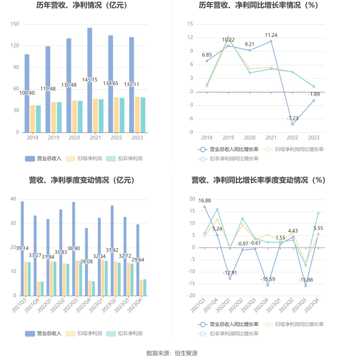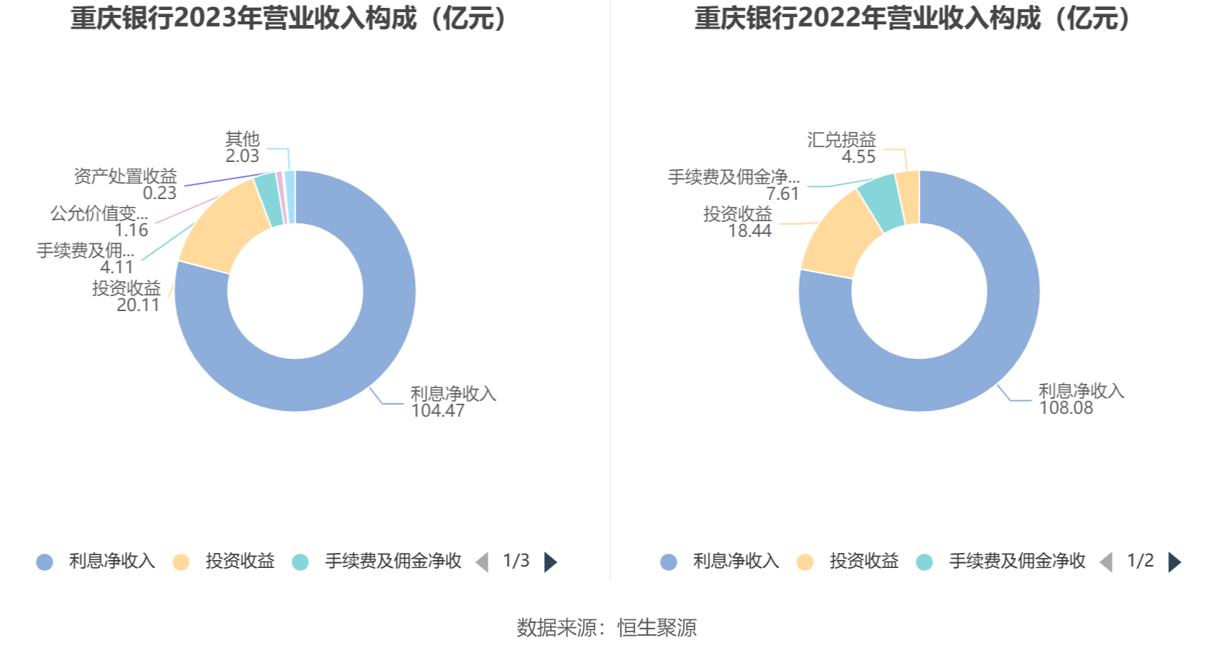 中证智能财讯重庆银行(601963)3月28日披露2023年年报。2023年,公司实现营业总收入132.11亿元,同比下降1.89%;归母净利润49.30亿元,同比增长1.27%;扣非净利润48.55亿元,同比增长1.14%;经营活动产生的现金流量净额为44.49亿元,同比下降16.23%;报告期内,重庆银行基本每股收益为1.36元,加权平均净资产收益率为10.14%。公司2023年年度利润分配预案为:拟向全体股东每10股派4.08元(含税)。 ![]() 以3月27日收盘价计算,重庆银行目前市盈率(TTM)约为5.16倍,市净率(LF)约为0.45倍,市销率(TTM)约为1.93倍。 ![]() 公司近年市盈率(TTM)、市净率(LF)、市销率(TTM)历史分位图如下所示: ![]() ![]() ![]() 数据统计显示,重庆银行近三年营业总收入复合增长率为0.41%,近三年净利润复合年增长率为3.68%。 ![]() 资料显示,公司主要在国内从事银行业务及有关的金融服务。 分产品来看,2023年公司主营业务中,利息净收入104.47亿元,同比下降3.34%,占营业收入的79.08%;投资收益20.11亿元,同比增长9.05%,占营业收入的15.22%;手续费及佣金净收入4.11亿元,同比下降45.96%,占营业收入的3.11%。 ![]() 2023年,公司经营活动现金流净额为44.49亿元,同比下降16.23%;筹资活动现金流净额163.20亿元,同比增加63.75亿元;投资活动现金流净额-209.77亿元,上年同期为-128.93亿元。 资产重大变化方面,截至2023年年末,公司其他债权投资合计较上年末增加25.74%,占公司总资产比重上升1.45个百分点;买入返售金融资产较上年末减少15.12%,占公司总资产比重下降1.23个百分点;货币资金较上年末减少2.44%,占公司总资产比重下降0.72个百分点;拆出资金较上年末增加165.39%,占公司总资产比重上升0.70个百分点。 ![]() 负债重大变化方面,截至2023年年末,公司吸收存款及同业存款较上年末增加8.06%,占公司总资产比重下降1.50个百分点;向中央银行借款较上年末增加58.25%,占公司总资产比重上升2.45个百分点;应付债券较上年末增加14.56%,占公司总资产比重上升0.63个百分点;卖出回购金融资产款较上年末减少43.73%,占公司总资产比重下降2.14个百分点。 ![]() 年报显示,2023年年末公司十大流通股东中,持股最多的为香港中央结算(代理人)有限公司,占比33.75%。十大流通股东名单相比2023年三季报维持不变。在具体持股比例上,香港中央结算(代理人)有限公司、香港中央结算有限公司持股有所上升,重庆市水利投资(集团)有限公司、国泰君安证券股份有限公司约定购回式证券交易专用证券账户、重庆市地产集团有限公司、重庆水务环境控股集团有限公司持股有所下降。 ![]() 筹码集中度方面,截至2023年年末,公司股东总户数为5.16万户,较三季度末增长了762户,增幅1.50%;户均持股市值由三季度末的54.96万元下降至45.92万元,降幅为16.45%。 ![]() 指标注解: 市盈率 =总市值/净利润。当公司亏损时市盈率为负,此时用市盈率估值没有实际意义,往往用市净率或市销率做参考。 市净率 =总市值/净资产。市净率估值法多用于盈利波动较大而净资产相对稳定的公司。 市销率 =总市值/营业收入。市销率估值法通常用于亏损或微利的成长型公司。 文中市盈率和市销率采用TTM方式,即以截至最近一期财报(含预报)12个月的数据计算。市净率采用LF方式,即以最近一期财报数据计算。 市盈率为负时,不显示当期分位数,会导致折线图中断。 |