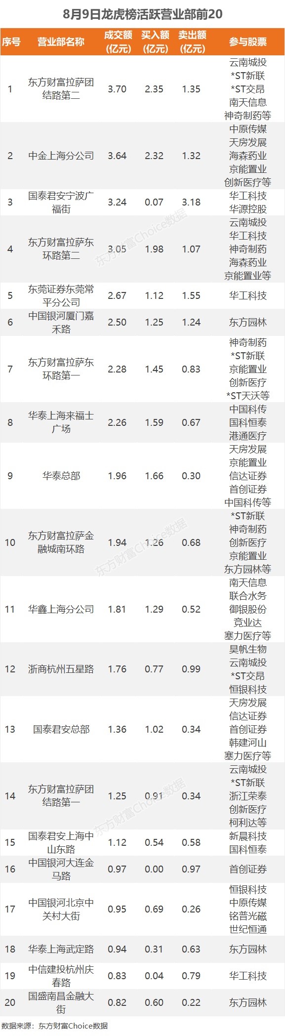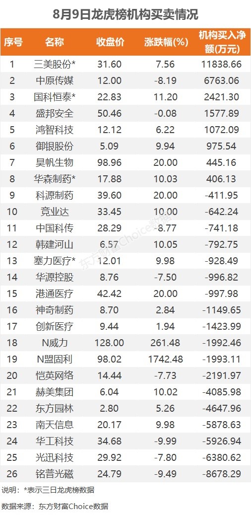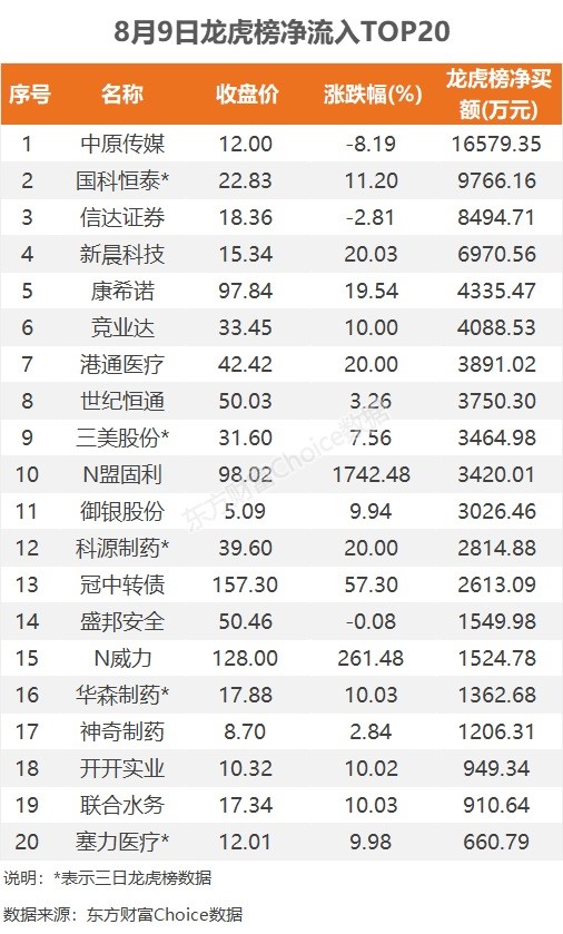 8月9日,A股三大指数均小幅下跌,截至收盘,沪指跌0.49%,报收3244.49点;深成指跌0.53%,报收11039.45点;创业板指跌0.01%,报收2228.73点。板块方面,医疗服务、生物制品、化学制药等板块涨幅居前,游戏、文化传媒、通信设备等板块跌幅居前。 ![]() 龙虎榜净流入TOP20 日内上榜龙虎榜个股中,资金净流入最多的是中原传媒,为1.66亿元。数据显示,该股日内大跌8.19%,全天换手率15.12%,成交额12.51亿元。资金净流入居前的深股通席位净买入6344.22万元,中金上海分公司净买入5918.16万元。 ![]() 活跃营业部前20 从活跃营业部角度来看,中金上海分公司日内成交3.64亿元,参与了中原传媒、天房发展、海森药业、京能置业、创新医疗等股票。华泰总部日内成交1.96亿元,参与了天房发展、京能置业、信达证券、首创证券、中国科传等股票。国泰君安总部日内成交1.36亿元,参与了天房发展、信达证券、首创证券、韩建河山、塞力医疗等股票。 ![]() 机构买卖情况 机构参与龙虎榜中个股共涉及26股,其中8股被机构净买入,三美股份被买入最多,三日净买入1.18亿元。另外18股被机构净卖出,铭普光磁被卖出最多,为8678.29万元。 ![]() 陆股通买卖情况 陆股通参与龙虎榜中个股共涉及15股,其中5股被陆股通净买入,光迅科技被买入最多,为7857.08万元。另外10股被陆股通净卖出,华工科技被卖出最多,为4150.53万元。 ![]() |