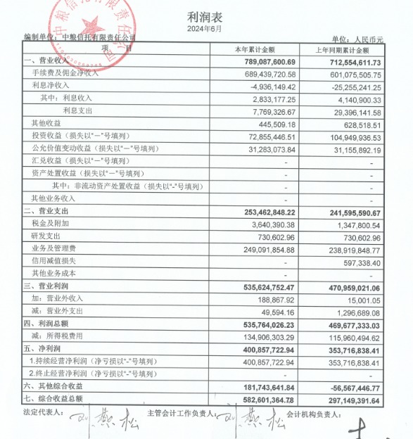 中国网财经7月15日讯日前,中粮资本(证券代码:002423.SZ)发布关于中粮信托2024年半年度财务报表的自愿性信息披露公告显示,上半年中粮信托实现营收 7.89亿元,同比增长10.74%;实现净利4.01亿元,同比增长13.33%。 数据显示,中粮信托2024年上半年手续费及佣金净收入为6.89亿元,同比上升14.70%。期间,其投资收益小幅下滑,从2023年同期的1.05亿元,下滑至7285.55万元。资产方面,中粮信托资产规模小幅上涨,期末达90.07亿元,较期初上升8.94%。 公开资料显示,中粮信托于2009年7月1日获中国银行业监督管理委员会批准开业,注册地北京,是由中国银保监会北京监管局监管的金融机构。公司注册资本为2,830,954,182元,中粮资本投资有限公司持股80.5090%;Bank of Montreal(蒙特利尔银行)持股16.2408%;中粮财务有限责任公司持股3.2502%。 ![]() |