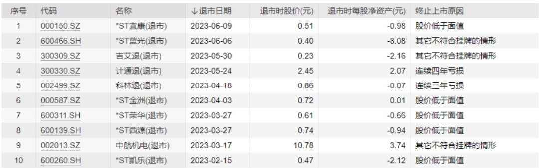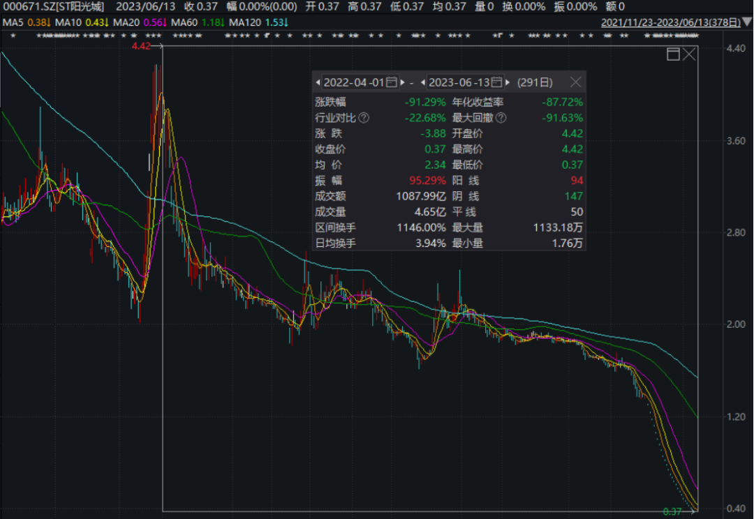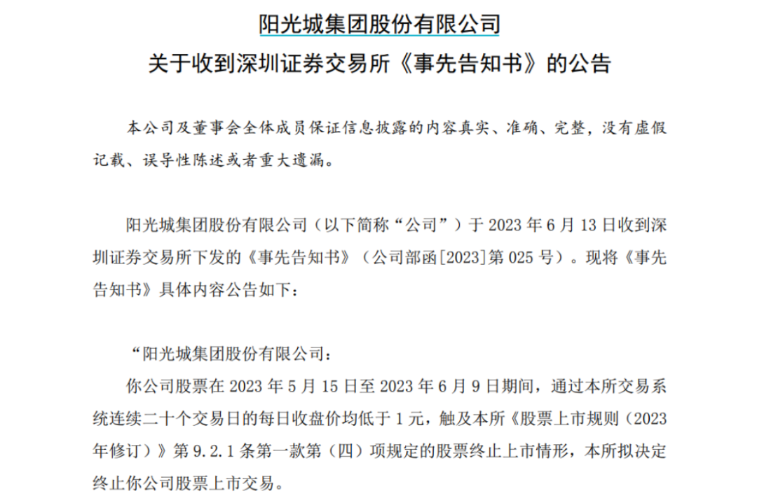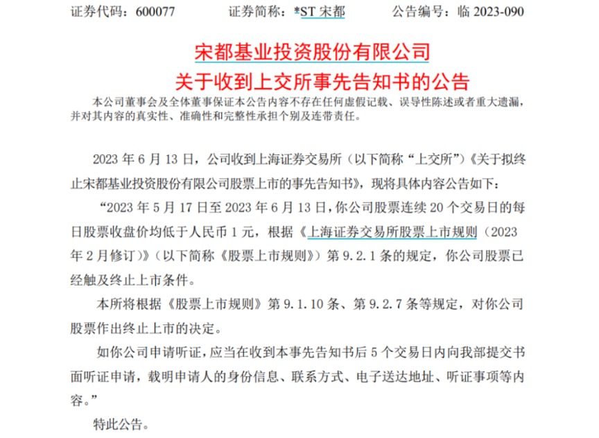 A股“退市潮”仍在继续,又有两家房地产企业被终止上市,近20万股民踩雷…… *ST宋都:公司股票终止上市 6月13日晚间,*ST宋都发布公告称,公司收到上交所《关于拟终止宋都基业投资股份有限公司股票上市的事先告知书》。2023年5月17日至6月13日,公司股票连续20个交易日的每日股票收盘价均低于人民币1元,根据上交所规定,公司股票已经触及终止上市条件。上交所根据相关规定,公司股票被终止上市。 ![]() 6月9日,*ST宋都发布关于“21宋都01”公司债券提前摘牌公告。 据悉,*ST宋都为宋都控股旗下上市公司,总部坐落于杭州钱江新城CBD核心区域,致力于专业的房地产开发与运营,旗下的地产集团是全国一级资质房地产开发公司,业务横跨浙江、江苏、安徽等三省六地,是浙江省知名的房地产开发企业之一。 但近年来*ST宋都的经营业绩表现不佳,2022年*ST宋都亏损进一步扩大,归属股东净亏损35.64亿元,同比下降803.84%。 ![]() 截至一季度末,*ST宋都有5.1万户股东。 ![]() ST阳光城:公司股票终止上市 此外,ST阳光城也于6月13日晚间发布公告称,公司股票在2023年5月15日至6月9日期间,公司股票连续二十个交易日的每日收盘价均低于1元,触及深交所《股票上市规则(2023年修订)》第9.2.1条第一款第(四)项规定的股票终止上市情形,拟决定终止公司股票上市交易。 ![]() 资料显示,ST阳光城以房地产开发为主业的全国化品牌企业,业务涵盖地产开发、商业运营、物业服务三大领域。经营模式以自主开发经营为主,开发业态包括住宅、办公和商业等,开发项目以销售为主,同时持有部分物业。 因公司2022年度被立信中联会计师事务所(特殊普通合伙)出具了否定意见的内控审计报告,阳光城触及被实施“其他风险警示”的情形,触发“戴帽”。自5月5日开始,该股连吃26个跌停板,股价连续跌破1元后直接导致公司退市。 4月份以来,该股已经累计跌超90%。截至一季度末,该股有13.75万户股东。 ![]() 或提前锁定“面值退市” 除了上述个股外,目前还有多只ST股最新收盘价低于一元,或在1元左右徘徊,有的已经提前锁定“面值退市”。 ![]() 据统计,今年以来已有10只个股退市,终止上市原因多为股价低于面值、连续亏损等。 ![]() 千亿房企迎来退市终局 阳光城后谁在危险边缘? |