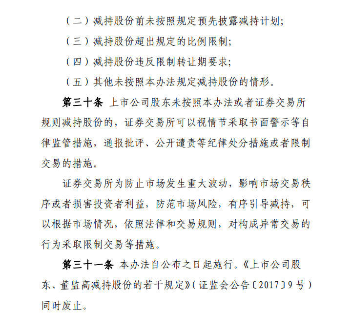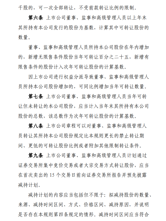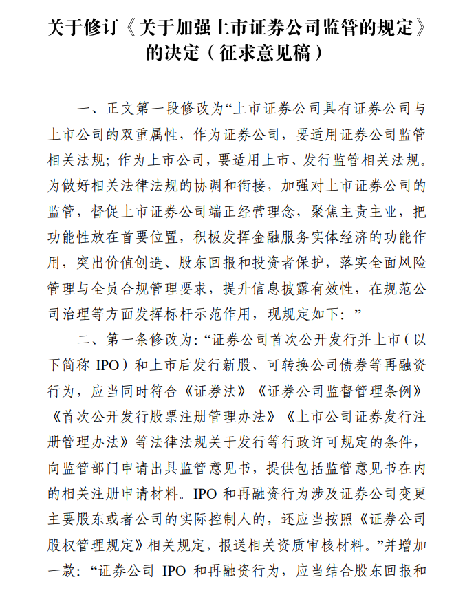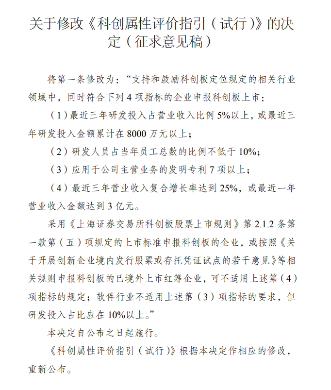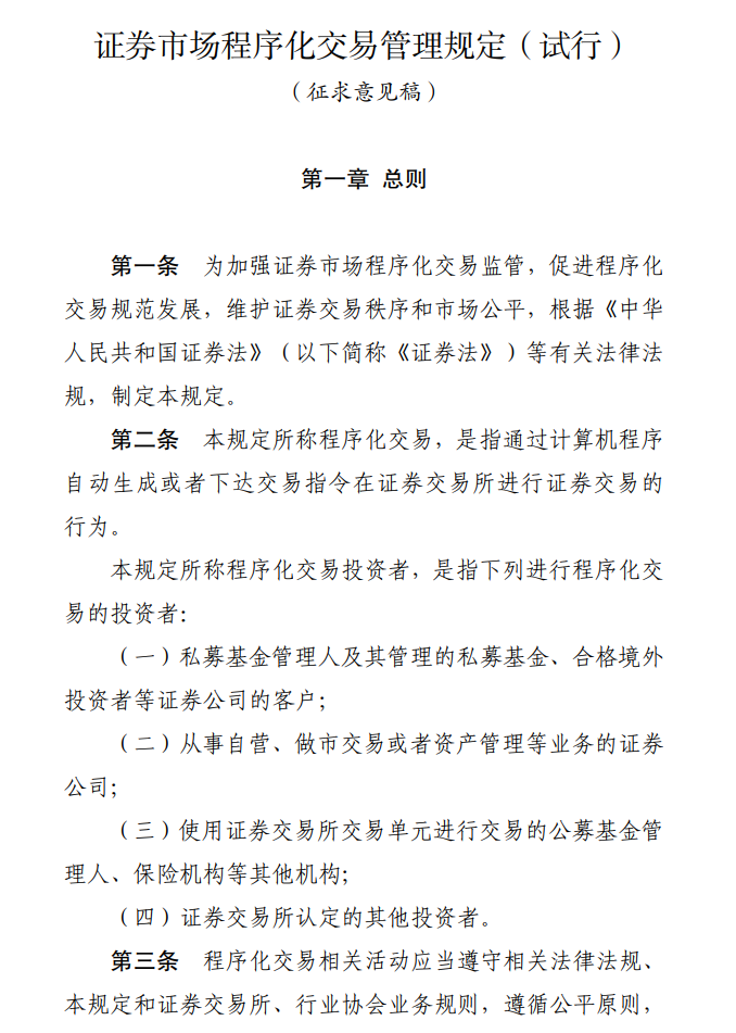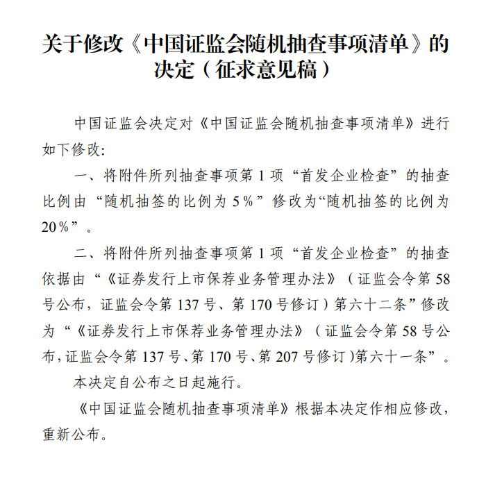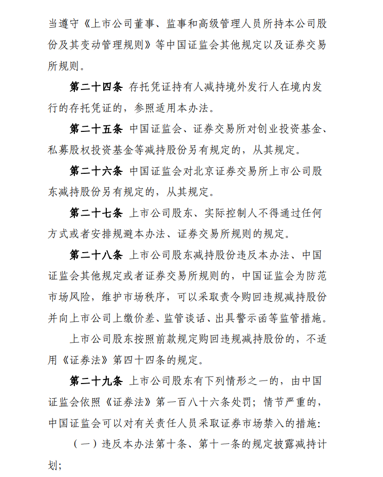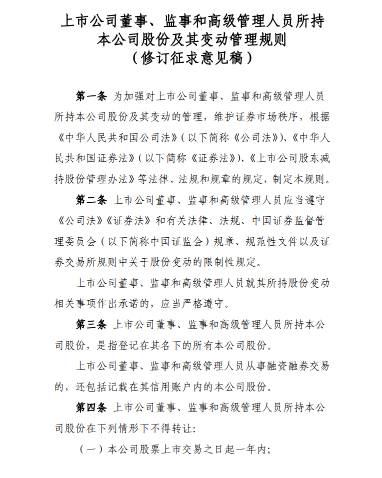 为深入贯彻落实中央金融工作会议以及《国务院关于加强监管防范风险推动资本市场高质量发展的若干意见》(以下简称《若干意见》)精神,推动资本市场“1+N”政策体系形成和落地实施,证监会制定并陆续出台相关配套政策文件和制度规则,现就涉及发行监管、上市公司监管、证券公司监管、交易监管等方面的6项规则草案公开征求意见。 ![]() 发行监管方面,包括2项规则修订。 一是修订《科创属性评价指引(试行)》。为落实《若干意见》关于严把发行上市准入关、完善科创板科创属性评价标准等要求,对申报科创板企业的研发投入金额、发明专利数量以及营业收入增长率设置更高标准,强化衡量科研投入、科研成果和成长性等指标要求,进一步引导中介机构提高申报企业质量,凸显科创板“硬科技”特色。 二是修订《中国证监会随机抽查事项清单》。为落实《若干意见》关于扩大对在审企业及相关中介机构现场检查覆盖面等要求,将首发企业随机抽取检查的比例由5%大幅提升至20%,并相应提高问题导向现场检查和交易所现场督导的比例,调整后,现场检查和督导整体比例将不低于三分之一。 上市公司监管方面,包括1项规则制定、1项规则修订。 一是制定《上市公司股东减持股份管理办法》。将原有的《上市公司股东、董监高减持股份的若干规定》上升为《上市公司股东减持股份管理办法》,以证监会规章的形式发布。内容上,保持原减持规定基本框架不变,同时结合各方面关注重点,在严格规范大股东减持、有效防范绕道减持、细化违规责任条款、强化关键主体义务等方面做了针对性完善。 二是修订《上市公司董事、监事和高级管理人员所持本公司股份及其变动管理规则》。吸收整合原减持规定中有关规范董监高减持股份的要求,进一步明确规定离婚分割股票后各方共同遵守原有减持限制。 证券公司监管方面,主要是修订《关于加强上市证券公司监管的规定》,旨在通过加强监管,发挥上市证券公司推动行业高质量发展的引领示范作用。 重点包括:督促公司端正经营理念,把功能性放在首要位置,聚焦服务实体经济和居民财富管理等主责主业;发挥现代企业治理的有效性,强化内部制衡,完善人员管理,优化激励约束,加强对境内外子公司的管控;落实全面风险管理和全员合规要求,强化风控指标信息披露;合理审慎开展融资,提高资金运用效率,提升投资者回报。 交易监管方面,制定《证券市场程序化交易管理规定(试行)》。 一是明确程序化交易的定义和总体要求。 二是明确报告要求。 三是明确交易监测和风险防控要求。 四是加强信息系统管理。五是加强高频交易监管。 六是明确监督管理安排。 七是明确北向程序化交易按照内外资一致的原则,纳入报告管理,执行交易监控标准,其他管理事项参照适用本规定。 此外,沪深北证券交易所同步就《股票发行上市审核规则》《股票上市规则》等19项具体业务规则向社会公开征求意见,涉及提高上市条件、规范减持、严格退市标准等方面。 欢迎社会各界提出宝贵意见。证监会及交易所将根据公开征求意见情况对上述制度规则草案进一步修改完善,履行程序后发布实施。 全部内容: ![]() ![]() ![]() ![]() ![]() ![]() ![]() ![]() ![]() ![]() ![]() ![]() ![]() ![]() ![]() ![]() ![]() ![]() ![]() ![]() ![]() ![]() ![]() ![]() ![]() ![]() ![]() ![]() ![]() ![]() ![]() ![]() ![]() ![]() ![]() ![]() ![]() ![]() ![]() ![]() ![]() |