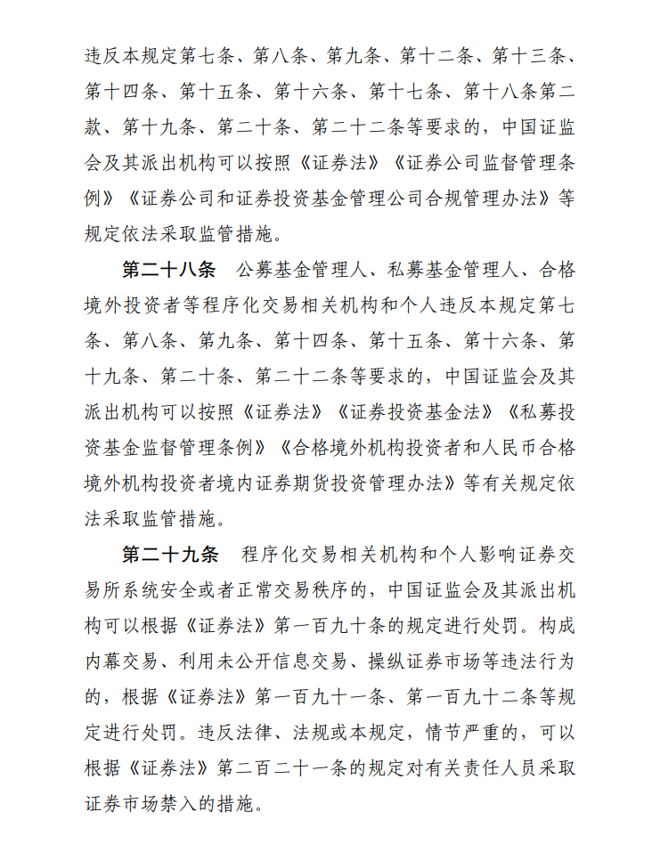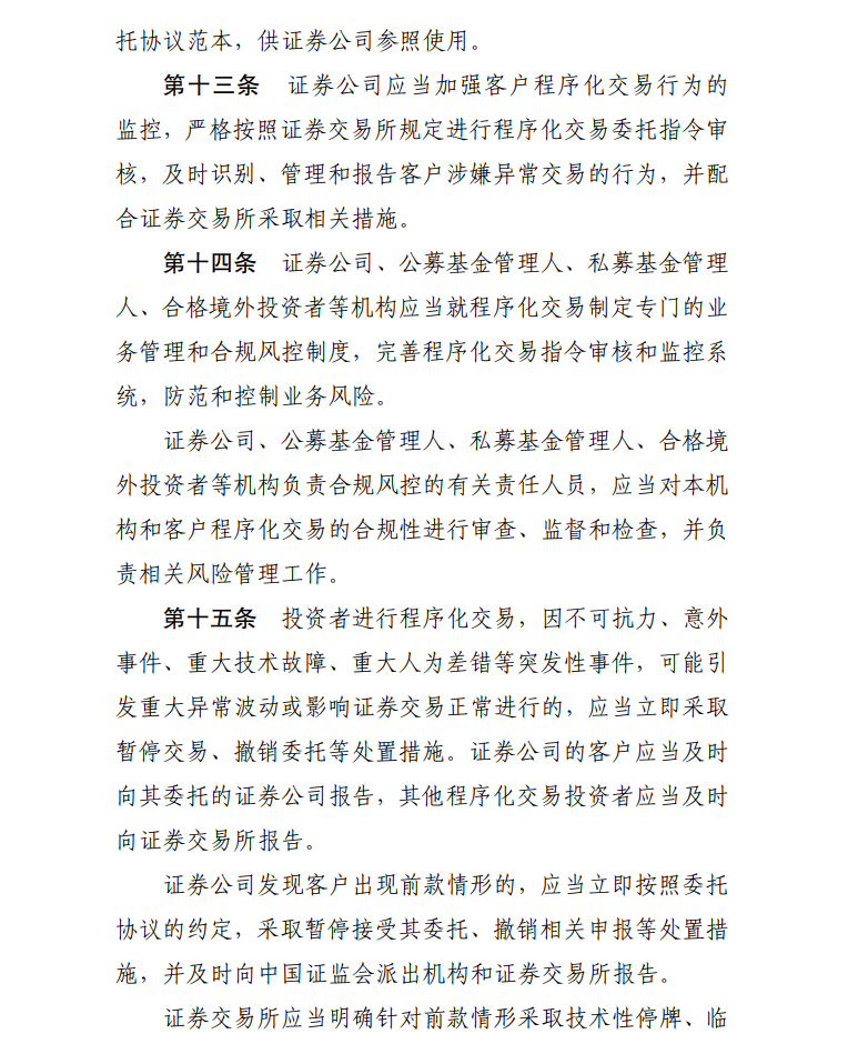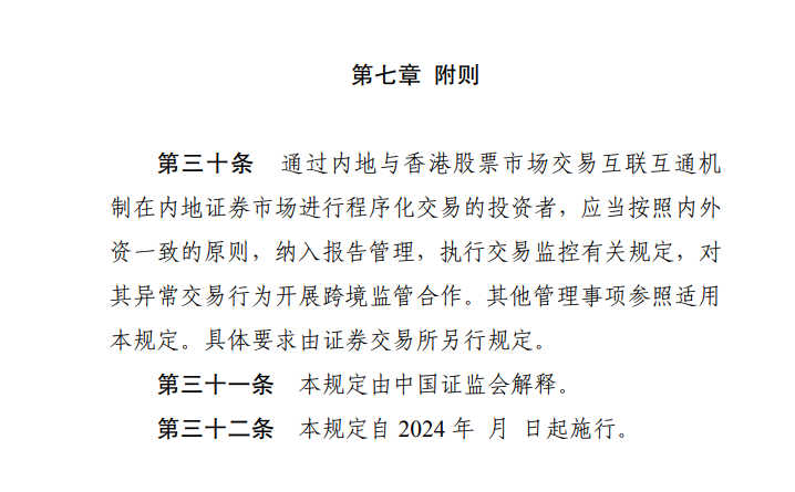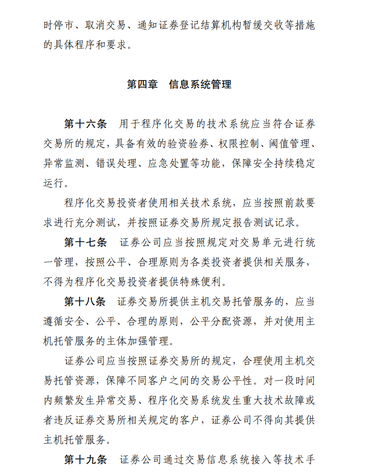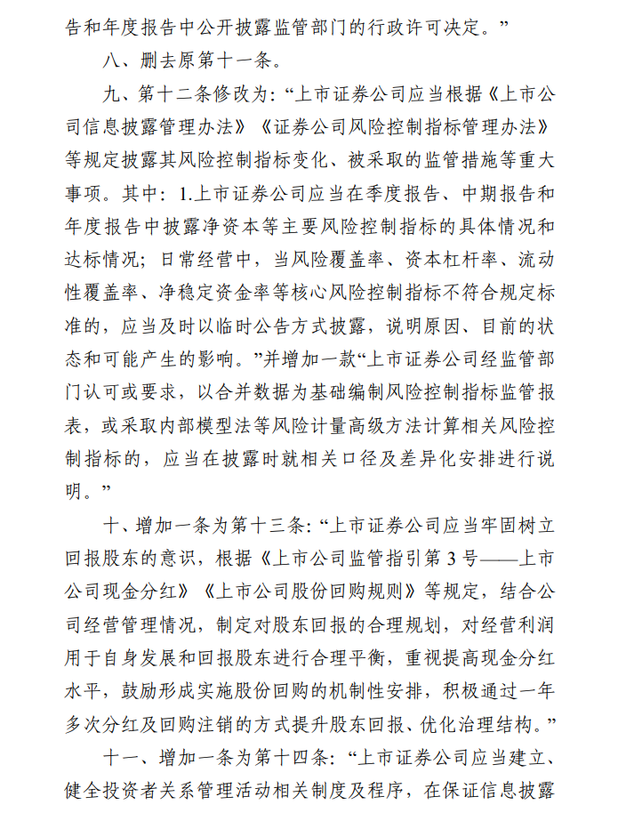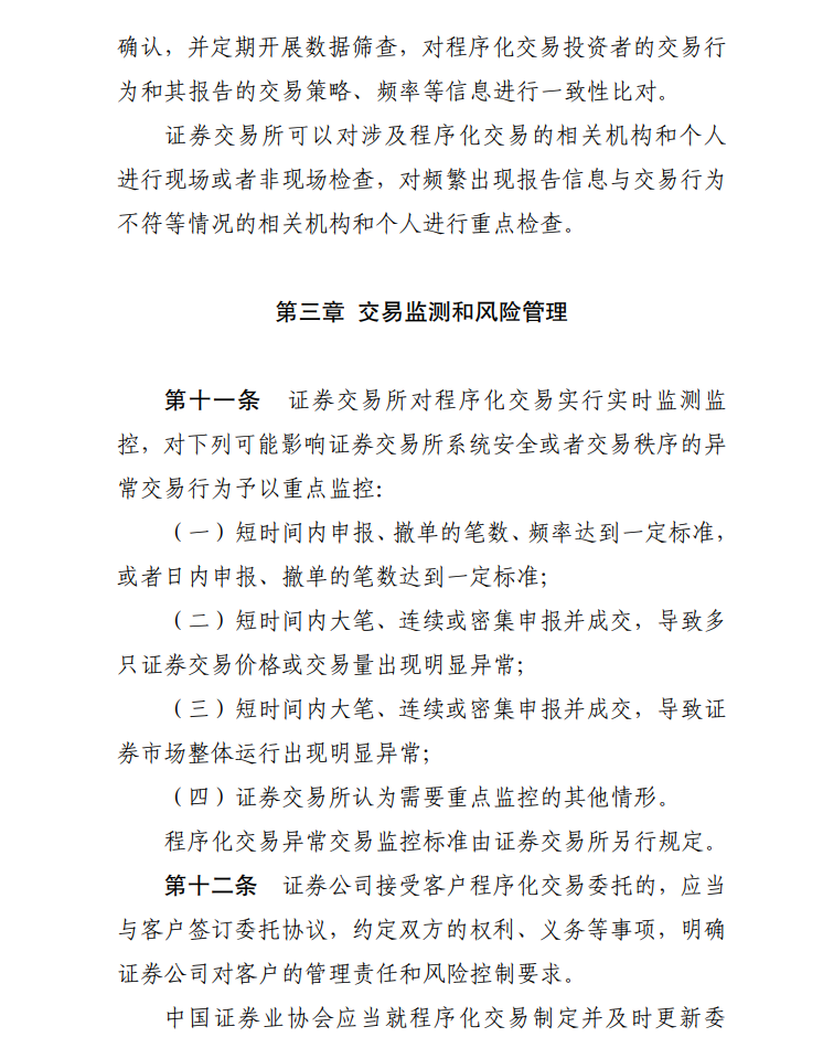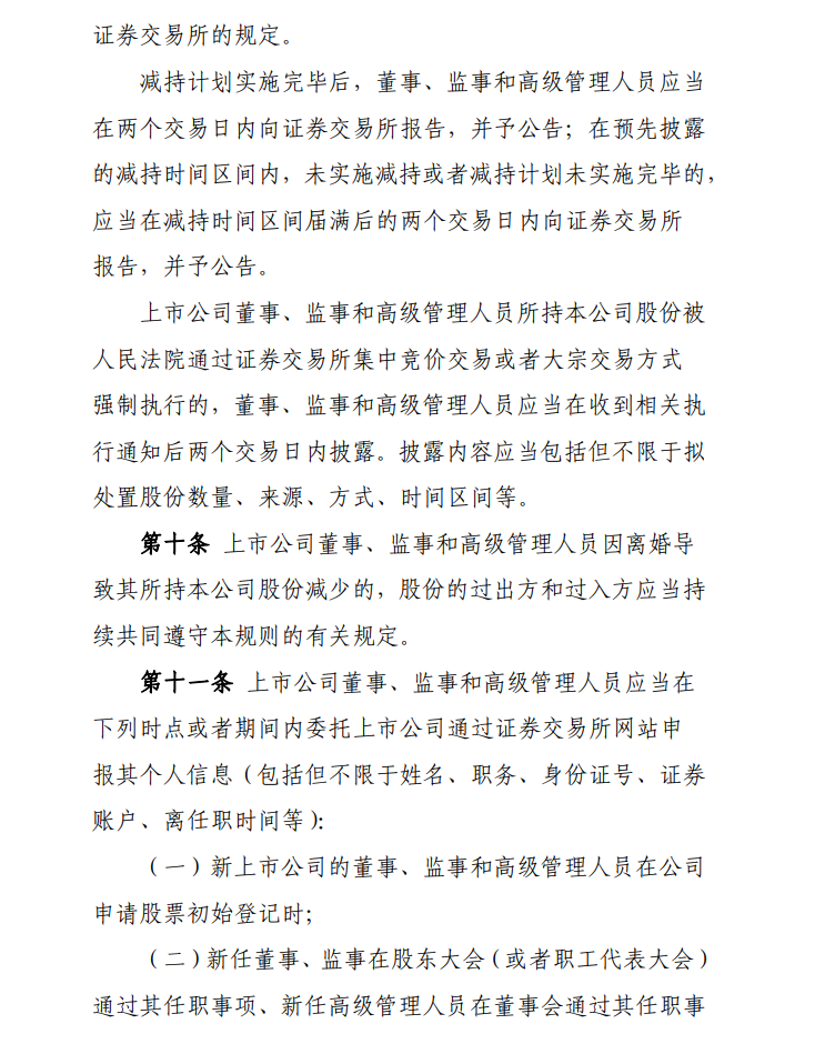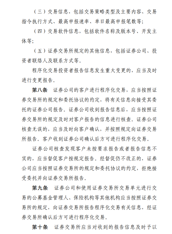 为深入贯彻落实中央金融工作会议以及《国务院关于加强监管防范风险推动资本市场高质量发展的若干意见》(以下简称《若干意见》)精神,推动资本市场“1+N”政策体系形成和落地实施,证监会制定并陆续出台相关配套政策文件和制度规则,现就涉及发行监管、上市公司监管、证券公司监管、交易监管等方面的6项规则草案公开征求意见。 ![]() 发行监管方面,包括2项规则修订。 一是修订《科创属性评价指引(试行)》。为落实《若干意见》关于严把发行上市准入关、完善科创板科创属性评价标准等要求,对申报科创板企业的研发投入金额、发明专利数量以及营业收入增长率设置更高标准,强化衡量科研投入、科研成果和成长性等指标要求,进一步引导中介机构提高申报企业质量,凸显科创板“硬科技”特色。 二是修订《中国证监会随机抽查事项清单》。为落实《若干意见》关于扩大对在审企业及相关中介机构现场检查覆盖面等要求,将首发企业随机抽取检查的比例由5%大幅提升至20%,并相应提高问题导向现场检查和交易所现场督导的比例,调整后,现场检查和督导整体比例将不低于三分之一。 上市公司监管方面,包括1项规则制定、1项规则修订。 一是制定《上市公司股东减持股份管理办法》。将原有的《上市公司股东、董监高减持股份的若干规定》上升为《上市公司股东减持股份管理办法》,以证监会规章的形式发布。内容上,保持原减持规定基本框架不变,同时结合各方面关注重点,在严格规范大股东减持、有效防范绕道减持、细化违规责任条款、强化关键主体义务等方面做了针对性完善。 二是修订《上市公司董事、监事和高级管理人员所持本公司股份及其变动管理规则》。吸收整合原减持规定中有关规范董监高减持股份的要求,进一步明确规定离婚分割股票后各方共同遵守原有减持限制。 证券公司监管方面,主要是修订《关于加强上市证券公司监管的规定》,旨在通过加强监管,发挥上市证券公司推动行业高质量发展的引领示范作用。 重点包括:督促公司端正经营理念,把功能性放在首要位置,聚焦服务实体经济和居民财富管理等主责主业;发挥现代企业治理的有效性,强化内部制衡,完善人员管理,优化激励约束,加强对境内外子公司的管控;落实全面风险管理和全员合规要求,强化风控指标信息披露;合理审慎开展融资,提高资金运用效率,提升投资者回报。 交易监管方面,制定《证券市场程序化交易管理规定(试行)》。 一是明确程序化交易的定义和总体要求。 二是明确报告要求。 三是明确交易监测和风险防控要求。 四是加强信息系统管理。五是加强高频交易监管。 六是明确监督管理安排。 七是明确北向程序化交易按照内外资一致的原则,纳入报告管理,执行交易监控标准,其他管理事项参照适用本规定。 此外,沪深北证券交易所同步就《股票发行上市审核规则》《股票上市规则》等19项具体业务规则向社会公开征求意见,涉及提高上市条件、规范减持、严格退市标准等方面。 欢迎社会各界提出宝贵意见。证监会及交易所将根据公开征求意见情况对上述制度规则草案进一步修改完善,履行程序后发布实施。 全部内容: ![]() ![]() ![]() ![]() ![]() ![]() ![]() ![]() ![]() ![]() ![]() ![]() ![]() ![]() ![]() ![]() ![]() ![]() ![]() ![]() ![]() ![]() ![]() ![]() ![]() ![]() ![]() ![]() ![]() ![]() ![]() ![]() ![]() ![]() ![]() ![]() ![]() ![]() ![]() ![]() ![]() |