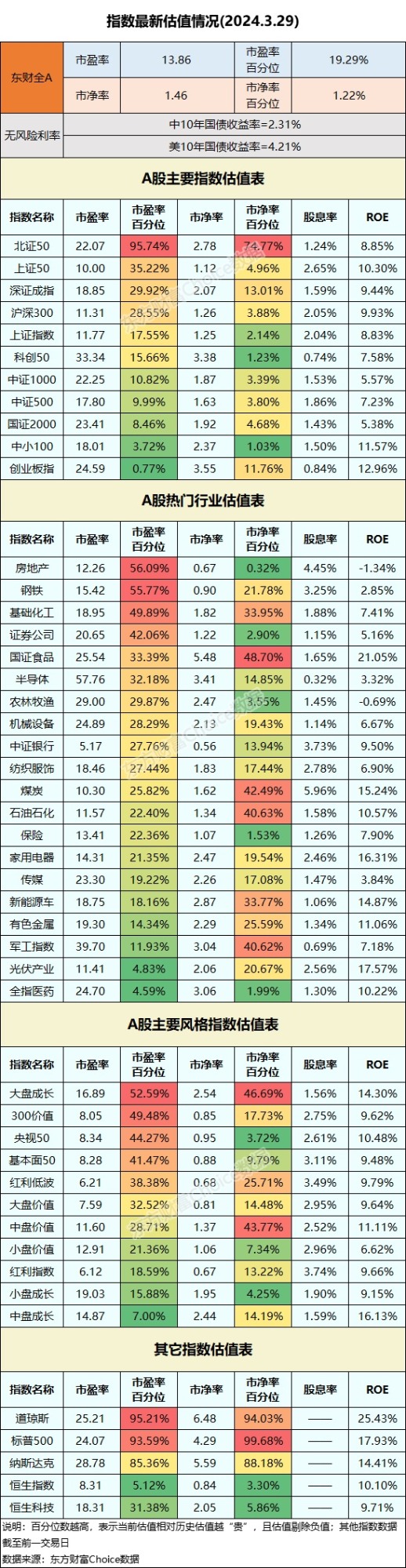 截至3月29日收盘,东方财富Choice数据显示,东财全A市盈率为13.86倍,市盈率百分位为19.29%;市净率为1.46倍,市净率百分位为1.22%。 宽基指数看,北证50的市盈率百分位较高,为95.74%。而创业板指、中小100的市盈率百分位较低,分别为0.77%和3.72%。 行业指数方面,房地产、钢铁的市盈率百分位较高,分别为56.09%和55.77%。而全指医药、光伏产业的市盈率百分位较低,分别为4.59%和4.83%。 风格指数方面,大盘成长的市盈率百分位较高,为52.59%。而中盘成长的市盈率百分位较低,为7%。 ![]() |