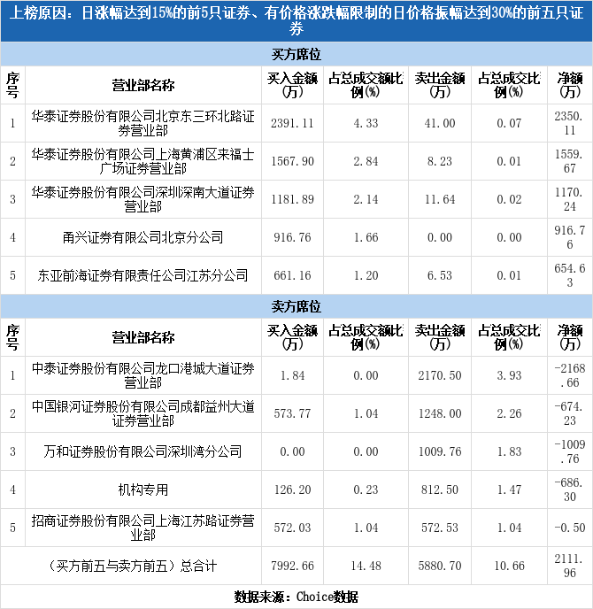 深交所2023年11月1日交易公开信息显示,森远股份因属于日涨幅达到15%的前5只证券、有价格涨跌幅限制的日价格振幅达到30%的前五只证券而登上龙虎榜。森远股份当日报收5.72元,涨跌幅为19.92%,换手率21.84%,振幅31.66%,成交额5.52亿元。 ![]() 11月1日席位详情如下: ![]() 龙虎榜数据显示,今日卖四为机构席位,该席位净卖出686.30万元,占该股今日总成交额的1.24%。除此之外还有N汽配、江苏吴中、宁波高发等20只个股榜单上出现了机构的身影,其中3家呈现机构净买入,获净买入最多的是誉衡药业,净买额为5352.75万元;17家呈现机构净卖出,其中遭净卖出最高的为N汽配,净卖额为1.13亿元。 今日榜单上出现了一家实力营业部。买二为华泰证券上海黄浦区来福士广场证券营业部,该席位买入1567.90万元,卖出8.23万元,净买额为1559.67万元。近三个月内该席位共上榜64次,实力排名第36。 注:文中合计数据已进行去重处理。 免责声明:本文基于大数据生产,仅供参考,不构成任何投资建议,据此操作风险自担。 |
