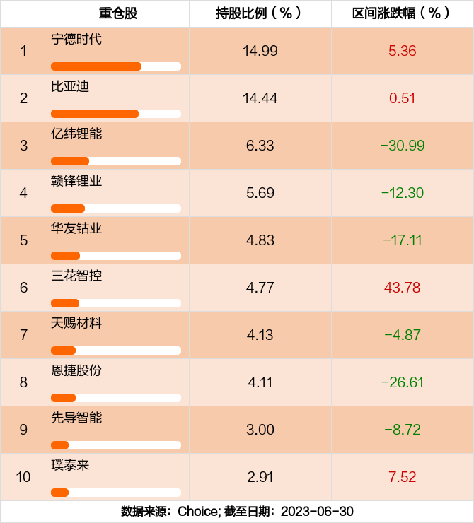 2023年度,截止至6月30日,建信国证新能源车电池ETF基金收益-7.94%,同期沪深300收益-0.75%,同类排名1545/1788。 基金年度回报 ![]() 前十大重仓股 建信国证新能源车电池ETF前十大重仓股分别是宁德时代,比亚迪,亿纬锂能,赣锋锂业,华友钴业,三花智控,天赐材料,恩捷股份,先导智能,璞泰来,前十大重仓股合计持股占总持仓比例65.2%。 建信国证新能源车电池ETF前十大重仓股 ![]() “腰部”持仓 根据建信国证新能源车电池ETF2023年半年报,该基金持仓比例排名11到20个股依次为:格林美,国轩高科,新宙邦,德方纳米,欣旺达,当升科技,星源材质,中国宝安,天华新能,多氟多。 建信国证新能源车电池ETF隐形重仓股 ![]() 加仓前十大个股 本期基金累计买入金额最高的前十大个股分别是华友钴业,璞泰来,孚能科技,鹏辉能源,容百科技,杉杉股份,厦门钨业,天华新能,派能科技,胜华新材。 建信国证新能源车电池ETF加仓前十大个股 ![]() 减仓前十大个股 本期基金累计卖出金额最高的前十大个股分别是宁德时代,比亚迪,蔚蓝锂芯,华友钴业,璞泰来,容百科技,德方纳米,赣锋锂业,胜华新材,天能股份。 建信国证新能源车电池ETF减仓前十大个股 ![]() 基金换手率 基金最新换手率为27.26%上一期换手率为56.31%。历史换手率最高为2022年6月30日,高达185.24%。 基金换手率变化 ![]() 基金持有人结构 根据建信国证新能源车电池ETF2023年半年报,最新持有人户数为4086人,较上期环比增加27.53%。其中,个人持有者占比91.18%,机构持有者占比8.82%。 基金持有人结构变化 ![]() 免责声明:本文基于大数据生产,仅供参考,不构成任何投资建议,据此操作风险自担。 |