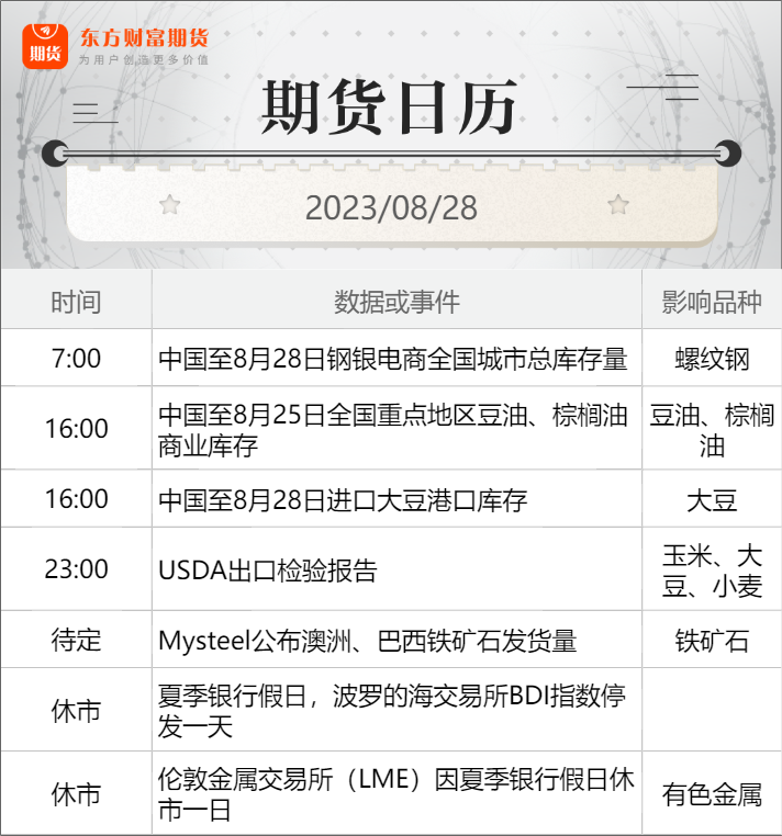 事关石化、钢铁、建材、有色!官方连发四份稳增长方案 全球大米价格飙升!世界最大大米出口国又出手了 财政部网站:为活跃资本市场、提振投资者信心,自2023年8月28日起,证券交易印花税实施减半征收。 财联社:美联储主席鲍威尔在杰克逊霍尔全球央行年会上表示,将谨慎地决定是否再次加息。在通胀持续放缓之前,将采取限制性政策。鲍威尔表示,如果有必要,美联储随时准备进一步提高利率,因为在降低通胀方面取得的进展虽然令人鼓舞,但还远远没有完成。要恢复价格稳定,还有相当长的路要走。 钢材:8月中旬,21个城市5大品种钢材社会库存963万吨,环比减少1万吨,下降0.1%,库存由升转降;比年初增加211万吨,上升28.1%;比上年同期减少11万吨,下降1.1%。(中钢协) 工业和信息化部原材料工业司司长常国武介绍,1—7月,钢铁行业工业增加值同比增长6.6%,较工业平均水平高2.8个百分点,全国生铁、粗钢、钢材产量分别为5.3亿吨、6.3亿吨和7.9亿吨,同比分别增长3.5%、2.5%和5.4%。(新京报) 民生证券近日研报指出,传统旺季逐步来临,钢材基本面有望改善,持续关注后续需求恢复力度。(界面新闻) 铁矿石:工信部等七部门发布关于印发《钢铁行业稳增长工作方案》的通知。其中提到,提高铁素资源等保障能力。充分发挥国内铁矿开发协调机制作用,加快国内重点铁矿项目开工投产、扩能扩产,确保合规矿企正常生产。鼓励有条件的企业,开展境外铁矿资源合作,特别是推进与周边国家铁矿资源勘查开采合作。开展铁矿石“红黄蓝”供需预警,强化期现货市场监管。(财联社) 煤炭:下游电厂库存高位,整体采购意向较弱。煤价止跌上涨,市场情绪稍有回温,货盘小幅释放,短期内弱势格局仍将持续,沿海煤炭运输价格继续底部波动。(上海航运交易所) 农产品期货 生猪:本周国内生猪价格较为平稳。据中国养猪网的数据,8月25日,生猪(外三元)价格为17.19元/公斤,与上周五(8月18日)的17.26元/公斤相比,下降0.4%。从一周均价来看,本周生猪均价为17.17元/公斤,与上周17.31元/公斤的均价相比,下降0.8%。(澎湃新闻) 玉米:本周,美国农业侦察员发现,由于干旱和授粉不良,美国南达科他州玉米存在果实不饱满的情况,玉米棒子的顶部并未长出饱满的玉米粒。农民们抱怨称,这些玉米好像已经被啃掉一半一样。另一产地俄亥俄州的情况也十分不乐观,侦察员称玉米还未完全成熟,这意味着很容易受到接下来一周热浪的影响。(财联社) 豆油:截至22日,8月大豆平均进口成本为4450元/吨,环比上涨5.65%;一级豆油全国均价8539元/吨,环比上涨2.44%。因原料主要依赖进口大豆,因此豆油价格变化一定程度上受到进口大豆成本的影响。(卓创资讯) 菜粕:本周沿海进口油菜籽压榨企业平均开工负荷率为41.93%,较上周相比提升11.36个百分点。压榨企业开工提升后,国内菜粕现货供应略有增量,利空菜粕价格。不过基于下游水产养殖对于菜粕仍旧存在刚需以及进口菜粕量下滑,总体菜粕现货价格下跌幅度不大。后续压榨企业开工或仍旧高于前期,叠加四季度即将进入水产养殖淡季,预期菜粕价格向上空间或有限。(卓创资讯) 有色/贵金属期货 工业硅:本周工业硅价格整体持稳。现货市场工业硅价格与上周相比变化较小,仅部分牌号和地区的价格上涨100-200元/吨,冶金级主流价格在13000元/吨-141000元/吨,化学级主流价格在14000元/吨-15200元/吨。过去一周(8月17-23日)工业硅2309主力合约收盘价格从13455元/吨小幅上涨1.08%至13600元/吨。(硅业分会) 碳酸锂:今年以来,锂电材料竞争加剧,新能源产业链市场形势面临供求关系急速逆转现象。上海钢联新能源事业部锂业分析师李攀对记者表示,“碳酸锂下半年供给端增量较多,预计碳酸锂价格仍有下行空间,传统的金九银十或许会被打破。”(财联社) 黄金:第三季度,国内金价一如既往表现强劲,与国际金价差价扩大,将是第三季度黄金市场最为显著的特征。截至作者交稿前,国内上海黄金交易所现货实盘合约Au99.99报价已经超过460元/克,比国际现货黄金价格整整高出了10元/克。这种现象的存在将激发黄金市场的更多套利行为,国内金价在第三季度接下来的时间内将面临更多抛压。(中国黄金报) 能化期货 原油:据洲际交易所(ICE),截至8月22日当周,布伦特原油期货投机性净多头头寸减少12964手合约至217771手合约;柴油投机性净多头头寸减少6151手合约至87790手合约。(财联社) 成品油:今天下午,记者从中国石化新闻办获悉,今年上半年,中国石化实现油气当量产量2.50亿桶油当量,同比增长3.3%,其中,天然气产量187亿立方米,同比增长7.6%。对于下半年市场需求,公司董事长马永生表示,预计下半年境内成品油、天然气需求保持增长,化工产品需求逐步复苏。(财联社) 纯碱:郑商所发布关于增设指定纯碱交割仓库的公告,经研究决定,增设衡水市棉麻总公司、湖北交投国际多式联运港有限公司为指定纯碱交割仓库,自公告之日起实施。(郑商所) 玻璃:工信部等八部门印发《建材行业稳增长工作方案》。其中提到,加强水泥和平板玻璃行业差别化管理。新改扩建项目严格落实相关产业政策要求,满足能效标杆水平、环保绩效A级指标要求。严格产能置换,遏制新增产能,禁止以技术改造等名义扩大产能。(财联社) 日本央行行长植田和男:日本通胀仍然低于目标的支持,这支持央行当前的货币政策策略。在2023年剩余时间内,日