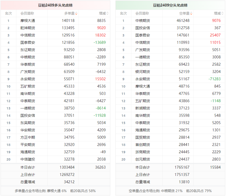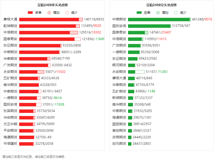 周二豆粕主力合约收涨3.25%,收盘报3591元/吨。 当日持仓为2240282手,较前一交易日增加92818手。 日内资金流入8.15亿元。 前20席空头持仓1765167手,共占全市场79%,其中空头第一名中粮期货占全市场21%。 前20席整体呈净空461683手,较前一交易日的净空482085手减少20402手。 ![]() ![]() 就空头而言,今日前20席较前一日增仓15584手,其中国泰君安、中信期货、中粮期货增仓明显,三机构分别增仓25407手,11015手和9076手。 ![]() ![]() 一周内中粮期货、国投安信、一德期货在豆粕上亏损居前,三机构分别亏损66787.96万元,44038.11万元,14479.77万元。 ![]() 总体而言,豆粕2409合约今日增仓上行,多空持仓排名前20席中,多空双方均呈进场态势,多头进场意愿强于空头。 |