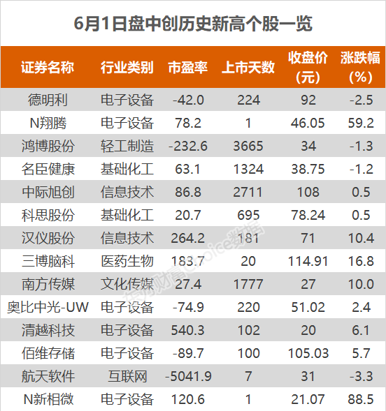 6月1日,沪指平盘报收,深证成指涨0.39%,创业板指涨0.59%。东方财富Choice数据显示,今日14只个股盘中股价创历史新高,包括鸿博股份、南方传媒等。