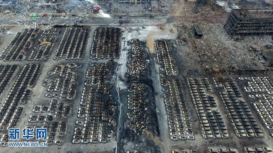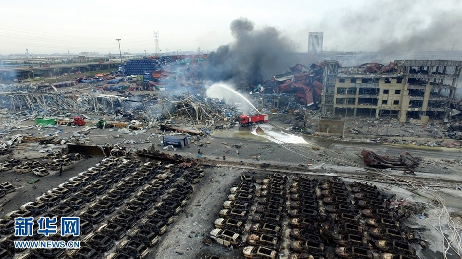 8月14日,新华网新闻无人机队深入天津滨海新区爆炸核心区域,直击天津港“8.12”重大火灾爆炸事故现场。航拍画面显示,天津爆炸中心点被炸出了一个巨大的深坑。图为航拍爆炸现场,爆炸中心被炸出一个深坑。 ![]() | |