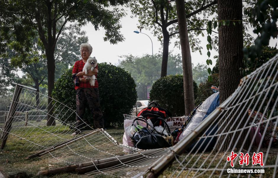 一名等待亲友的奶奶在草坪上抱着她的狗。 中新社发 张浩 摄 ![]() | |