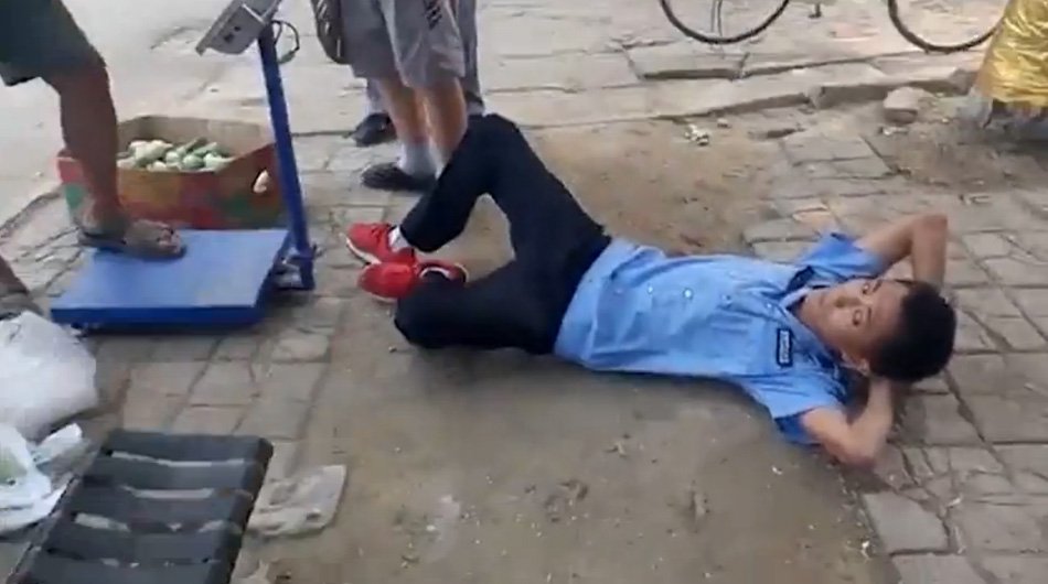视频显示,两名城管正制止小贩占道经营,制服男子与小贩僵持不下时,后者说“你别搬了”,男子突然倒地,大叫“我不行了,快报警!报警!”双方口角后,倒地男子称“都说了不是一回两回了”,随后站了起来。图为城管倒下一幕。 ![]() | |