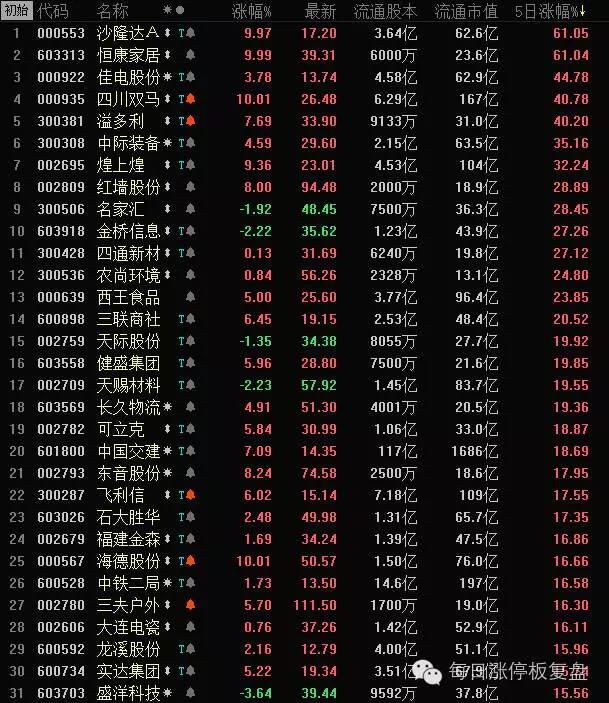 填权:煌上煌、溢多利、名家汇、金桥信息(智慧党建)、四通新材、可立克、东音股份、盛洋科技 大象:中国交建、中铁二局、佳电股份(国企改革)、(航天军工的龙溪股份) 次新:红墙股份(马蓉概念股?)、农尚环境、长久物流、恒康家居(新股开板) 相似逻辑:沙隆达A、中际装备、西王食品、实达集团、四川双马、海德股份 庄票:健身集团(收益人民币贬值)、福建金森、三夫户外 智慧党建:金桥信息、飞利信 锂电池:天赐材料、石大胜华 其他:三联商社(安全手机加密第一股)、天际股份(27亿购锂电池燃料公司+填权) 评论员私人企鹅号码:QQ292095133推荐码3302,每天空间公布大盘走势,操作策略分享以及个股强股免费推荐, | |