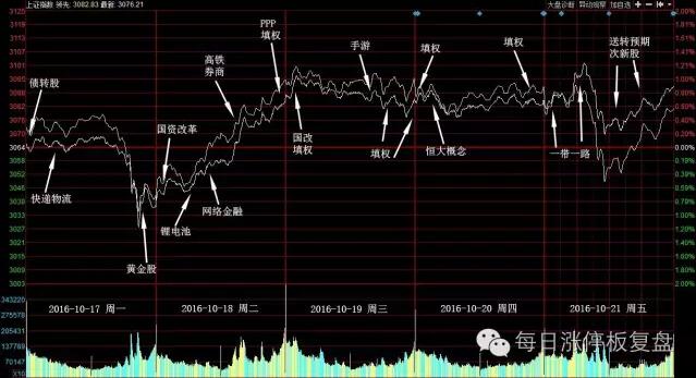 龙头题材在开篇已经说的差不多了,而且每天盘面也都有总结,这里就简单说几句。周一,延续上周行情的余温,债转股和股权变更活跃,超跌反弹的锂电池、受益于双十一临近的快递以及弱势炒的次新股助攻。 周二,国资改革在佳电股份的带领下起来护了大盘强势反包,同时中字头的人气中铁二局,超跌反弹的PPP,人气标杆四川双马所属的股权变更以及每年这个时候必炒的填权助攻。 周三,填权溢多利接过名家汇的大旗继续走强,国改在佳电股份的带领下继续助力,妖王之王四川双马和次新股也依旧不甘示弱的在继续呼吁人气。 周四,填权继续贯穿,智慧党建概念亮相,曾经的庄票也打了一场非常漂亮的联动仗,OLED和股权变更客串。 周五,开盘氛围转弱,弱势炒次新依旧有效,次新股在川金诺率先强势封板的情况下,下午起来为大盘挽救人气。大象起舞的一带一路表现值得商榷。 3、引领盘面的热点题材