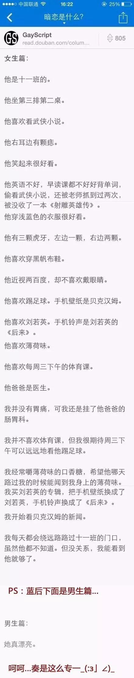 1、男朋友是个医生!小侄重感冒,男友要给他打针,小侄害怕就是不让扎屁股! 最后哭着说“叔叔,我姑姑也感冒了,你怎么不给她打针!?”男友附在小侄耳边说了几句,小侄开心的配合扎 针,大喊“哈哈!!姑姑,你完蛋了,叔叔说晚上多给你扎几针!” 一屋子人都笑了,我羞的脸通红。。。 这公司的工作环境还是可以接受的 2、和男朋友吵架,楼主一气之下跑到闺蜜家三天了。 昨晚,闺蜜房里传来一阵阵嗯嗯啊啊的叫声,听的我耳热心跳......尼玛,实在受不了,我连夜逃了回去。 一大早,闺蜜就来电问我 : 跟他和好了吧?我说好了!闺蜜哈哈大笑 : “好!不枉我带着大姨妈干嚎了半宿!” 是不是突然感觉做单身狗没那么自卑了,毕竟这么可爱的妹子也没有男朋友 3、问:饥饿和饥渴的区别? 答:区别在于把香蕉是拿来吃还是拿来用。······ 收到快递的我眼泪掉下来 4、.有个富豪找佣人,面试的题目是上厕所,前几个上完后都没有洗手就出来了,富豪因此把他们打发走了,只有一个洗了手,于是富豪留下了他。可是有一天,富豪却发现他没有洗手就出来了,富豪问他是为什么? 佣人答到:“偶今天带了手纸……” what?这年头都怎么了,能不能多点真诚 5、我本来以为女友是我的真命天女。 直到那天我发现她的抽屉里有一件护士装,一套女仆装,和一身警察制服。 这个女人连一个工作都不能做长久,肯定不适合我。 在男女生暗恋这件事儿上,男生是那么的专一! 招手即停。。。 哥们实力派演技啊! 这酸爽~够劲儿! 哼,疼死人家了 妹子要坚持住,我们需要免费wifi 下 面 我 宣 布 这 次 装 B 失 败 了 ! ! ! 这几个姑娘,你们是经历过什么打击? 这 T M 谁 P 的 ,你 给 我 出 来 欢迎关注【搞笑弟】每天都有搞笑段子、创意漫画,与您相见 | |