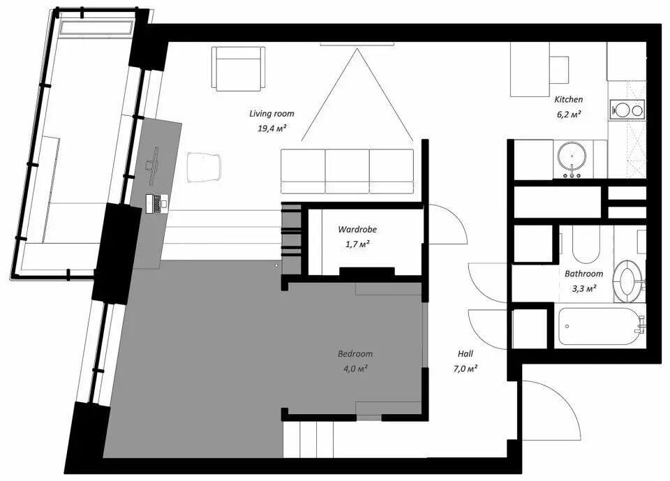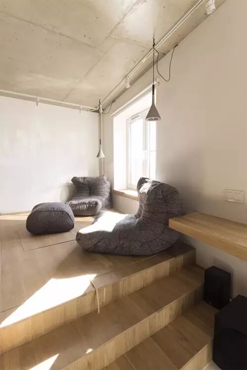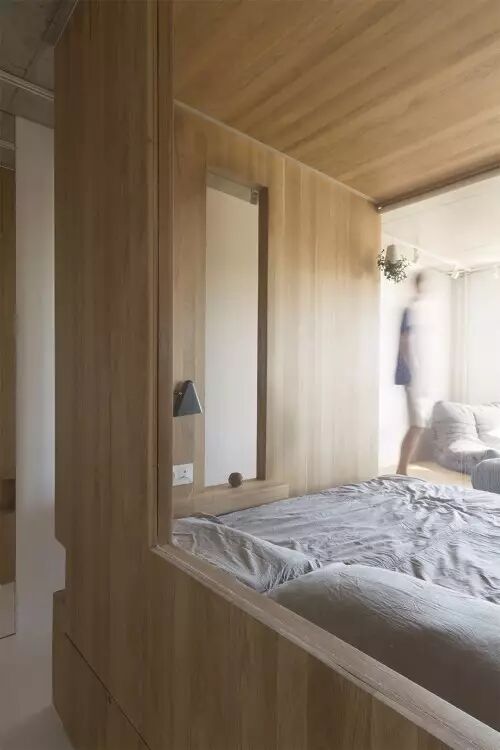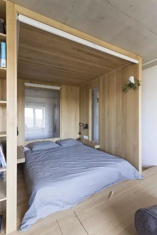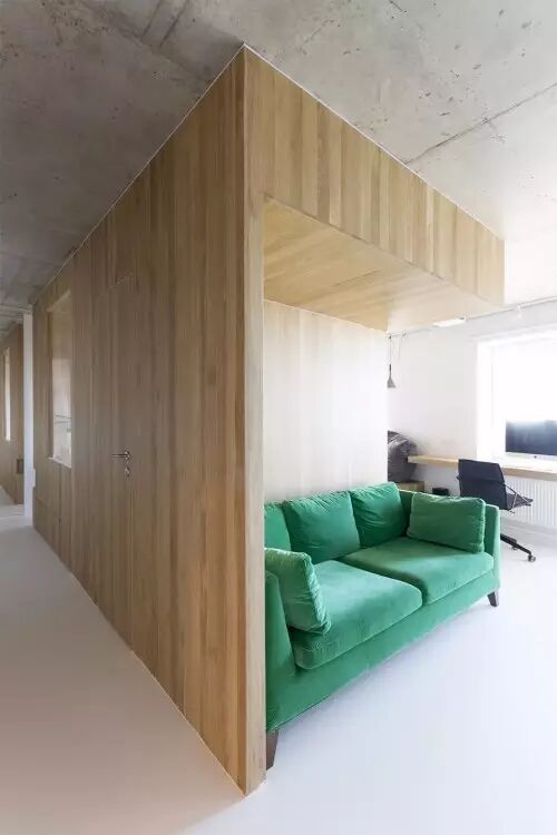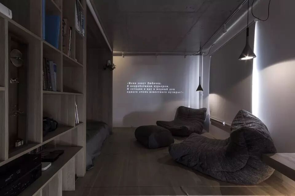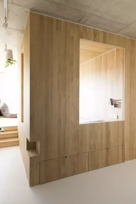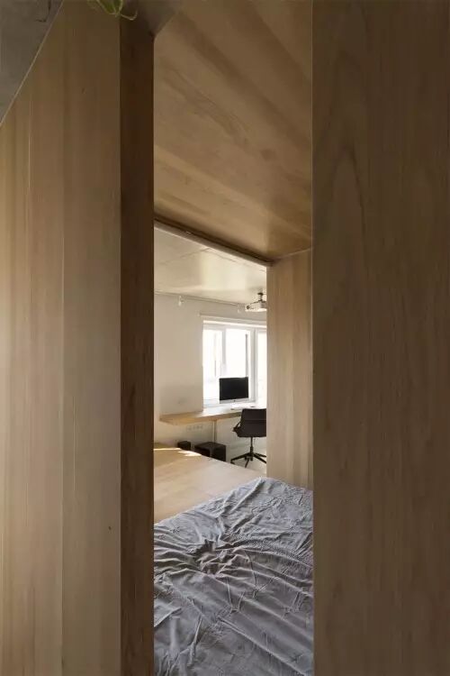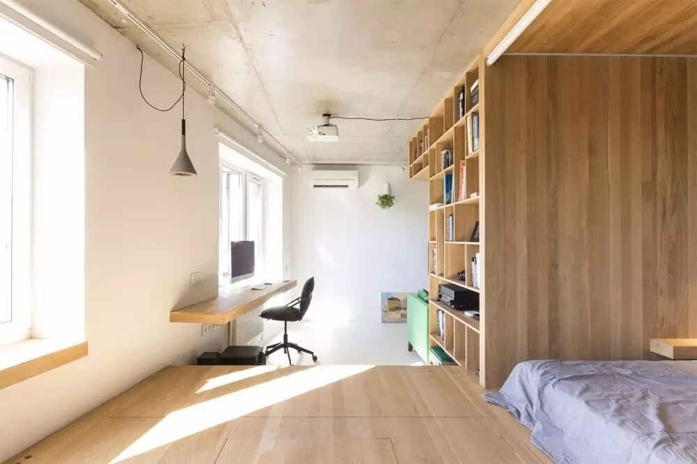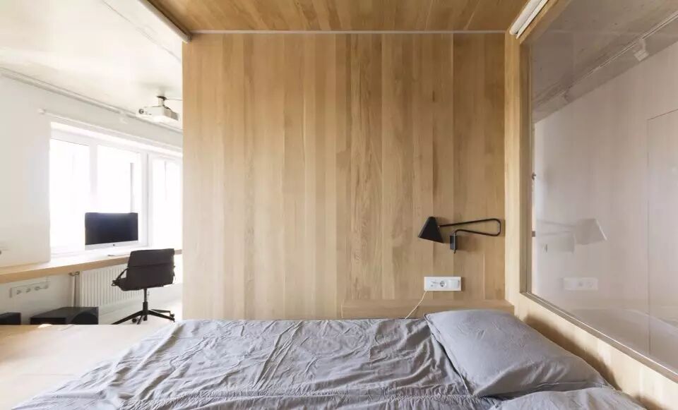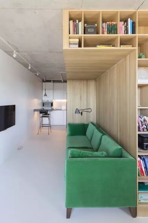 空间再小, 也要精致生活! 俄罗斯 ?莫斯科 房子是一个建筑面积47㎡的“大盒子”。为什么说是大盒子呢?因为,这个房子没有承重构件,说白了就是没有墙!房君之前介绍了非常多的改造住宅,第一项肯定是砸墙,像这样空空如也的房子,屋主可以随着自己的喜好随便划分。没有噪音,没有装修产生的垃圾,也不用担心物业罚款,大家是不是觉得这样的房子比较好呢? 平面图▼ 先上一张平面图哈,看看设计师是怎么分配空间的。设计师在屋子中间做了一个多功能木结构,它包括工作区、睡眠区、投影室区、衣帽间、沙发区;围着这个木结构的空间是:客厅、厨房、卫生间;还有一个四通八达的走廊。 会客区▼ 进门先看到客厅的绿色沙发和壁挂式电视机,还有远处的厨房。沙发正好嵌入到多功能木结构里,上面和侧面木格,用来收纳图书。这个区域可以作为会客区,也可以作为书房使用,沙发旁边安装了小巧的壁灯,方便阅读。 工作区▼ 沿着窗台以及旁边的墙壁安置了长长的实木桌。把采光最好的地方用来办公,看来屋主一定是个热爱工作的进门青年~ 从对面的角度看过来,充足的阳光,后面就是书架,拿取资料会非常的方便。 投影区▼ 从台阶上来,就是一个实木坐塌,放有灰色懒人沙发。白天在窝在沙发里晒太阳也是个不错的选择。如果来了朋友,也可以当作客房,温暖的实木也不会冰冷~ 拉下遮光的卷帘,对面的白墙秒变屏幕,小型影院立即呈现,这个画面这有点导演厅的意思! 睡眠区▼ 这个4㎡大的空间就是卧室了,虽然在一个木盒子里,装了窗户后就不会觉得那么憋闷了~床的一侧是书架,另一侧室小巧的床头柜,还安装了壁灯。窗户和“门”都安装了卷帘,可以保护隐私。 看下细节哈,这边是壁灯和床头桌。 多功能木结构的全景。生活空间紧凑合理的在一起 走廊区▼ 从这个台阶下来,就走到多功能木结构的后面了。这条长长的走廊,始终围绕着木结构,大家跟房君一起往前走~ 从侧面的窗户望向睡眠区。 从后面的窗户望向睡眠区和投影区。 然后是长长的走廊~混凝土的屋顶,白色的墙和地面,以及原木色的多功能木结构,构成了房子主色调。走廊的末端还安装了镜子,让视觉有了延伸,觉得这个走廊好长好长~看到木结构上有一个把手了吗,那个是屋主的衣帽间,对面是浴室,这个设计非常合理哦~ 走廊经过衣帽间,卫生间,厨房,然后就绕回到客厅,然后从台阶上去是工作区。看清楚了吧,这个走廊是能围着多功能木结构转一圈的~房君想说,在这里玩捉迷藏一定非常有意思! 卫生间▼ 卫生间酷酷的,混凝土的墙壁,白色的极简卫浴和地板。屋主一定是个工业风控! 厨房▼ 精致的小厨房,风格延续了整个家的酷酷工业风。 — end — 设计:Ruetemple 好房子综合整理编辑 投稿、合作 请邮件至:ihaofangzi@qq.com 装个好房子 探寻美好居住方式,一起装个美美的家 ▲ 长按二维码,关注装个好房子 精彩推荐(▼点击图片跳转) 你可能还想读(▼关注后后台回复数字) 回复『1』『原创』| 查看【i好房子】系列文章 回复『2』『玄关』| 查看玄关的设计和装修 回复『3』『厨房』| 查看厨房的设计和装修 回复『4』『客厅』| 查看客厅的设计和装修 回复『5』『阳台』| 查看阳台的设计和装修 回复『6』『卧室』| 查看卧室的设计和装修 回复『7』『收纳』| 查看收纳技巧 回复『8』『飘窗』| 查看飘窗的设计和装修 回复『9』『背景墙』| 查看背景墙的设计和装修 回复『10』『卫浴』| 查看卫浴的装修和设计 回复『11』『DIY』| 查看实用、有趣的DIY 喜欢就按个 | |