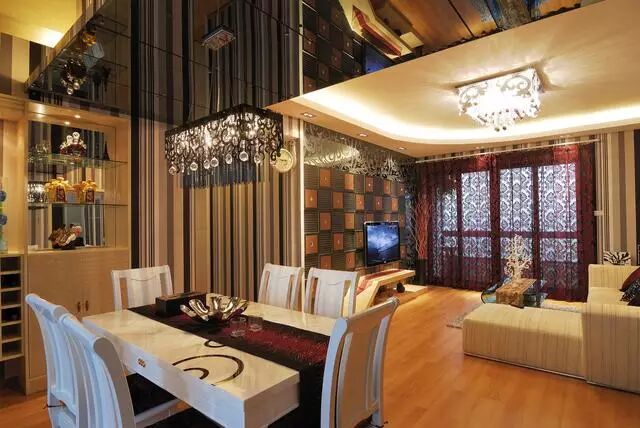 本案设计中 整体颜色浅黄色为主,使整个空间显得浪漫温馨。整个空间在茶镜的对比下,显得更加深动,在这个现代简约的元素里面融合了一部分的古典的炫丽。显得整个空间有特色,在细部处理方面采用了艺术雕花的搭配,让整个空间视觉效果更加的强烈。