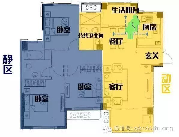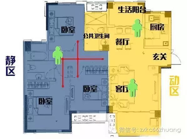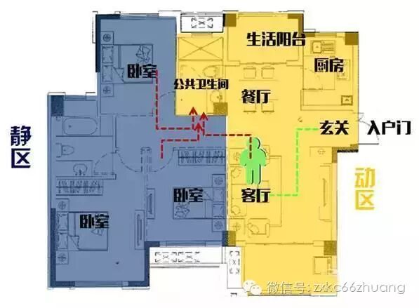 ? 装修快车网www.66zhuang.com,中国公益装修平台第一品牌,专业为新生代的业主高效率解决装修问题,致力于装饰行业更阳光透明!所有装修问题,一个微信就够了!装修知识、装修图库、装修公司,让装修更简单!关注我们妥妥没错!(咨询热线:400-6058678) 什么样的户型才算是一个好户型?首先要具备的就是各功能分区合理,也就是动静分区,其次动线要互不干扰。关于动静分区在之前的文章中已经详细地讲述过了,下面就来了解一下什么叫动线合理。 什么是户型的动线? 动线是指人们在户内活动的路线,动线是否流畅影响到人们各种活动转换是否能顺利实现。而户型的设计会影响到动线的走向,好的动线能够提升户型利用率,进而提高人们的居住品质。差的动线则会使大户型变得“大而无当”,浪费空间。 户内动线主要有三种,分别是居住动线、家务动线、来客动线。良好的动线是指从入户门进客厅、卧室、厨房的三条线不会交叉。 一、来客动线 来客动线,顾名思义就是客人从入户门到客厅到阳台以及公共卫生间的行动路线,好的来客动线最好是跟家务动线和居住动线没有交叉,以免影响家人休息和工作,如下图: 三房户型整体动静分区明显,来客动线基本不影响另外两条动线,不打扰家务动线和居住动线。公共卫生间设置在客厅与次卧之间的过渡位置,无论从客厅还是次卧均可非常方便的到达。特别是晚上老人和小孩使用卫生间时,方便在卧室门口就能到达,避免了动线过长老人小孩晚上上洗手间影响他人休息,同时也提高了安全性。 二、家务动线 家务动线主要区域在厨房、生活阳台、餐厅,厨房最好设在靠近入户门的位置,最好不要穿过客厅或卧室再进到厨房。生活阳台连接厨房,方便洗衣服和拖地。厨房与餐厅最好连为一体,这样不影响做饭上菜。如下图: 三房户型入户右侧即厨房,厨房入口直接连接餐厅,与生活阳台相连,方便洗菜和拖地,这个家务动线基本连为一体,不影响来客和居住动线。 三、居住动线 居住动线主要行动区域一般在卧室,为主人的私密区域,最好不要跟来客动线和家务动线有交叉,影响私密性。如下图: 下面从三条动线整体的展示一下: 1、动线良好 从入户门进客厅、卧室、厨房的三条条线不会交叉 2、动线较差户型 进厨房要穿过客厅,进主卧要穿过客厅,客厅都成公共走廊了,另外厨房布置在户型深区,卫生间距离主卧和次卧都很远,且正对大门,该户型堪称灾难级! 喜欢这个设计吗?喜欢就到装修快车网上发布装修信息,海量的高端设计师提供免费的户型设计,量房与设计报价都是不收任何费用的,更有各种装修案例供你参考,现在马上申请还能免费抽奖,更有机会获得装修免单哦! (装修,就上装修快车网) 正在浏览此文章 关注装修快车网微信: 如果觉得挺好的,很实用,就分享给朋友吧! ①海量装修效果图,实用的装修知识 ② 免费申请上门量房、设计、报价 ③一对一的装修服务 专业解答 ④QQ业主群:(540370854)全国业主互动 ↙点击“阅读原文”花一分钟发装修招标立省30% | |
