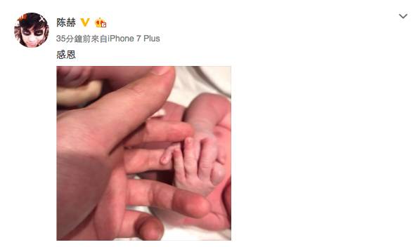 陈赫微博刚刚晒了一张与宝宝的牵手照, 并配文:感恩 宣布新生儿的降临。 陈赫经纪人对外回应:张子萱是今天上午在上海产下的女儿,BB六斤六两,母女平安,小夫妻对孩子的到来感到十分幸福。 恭喜恭喜啊! ———————————— 全亚洲顶尖华语音乐电台 | |