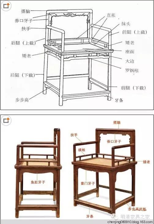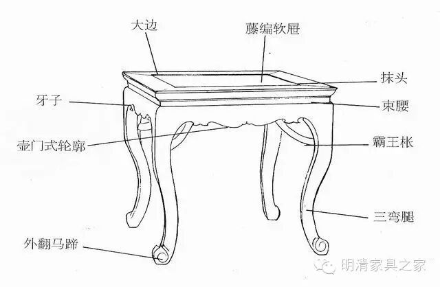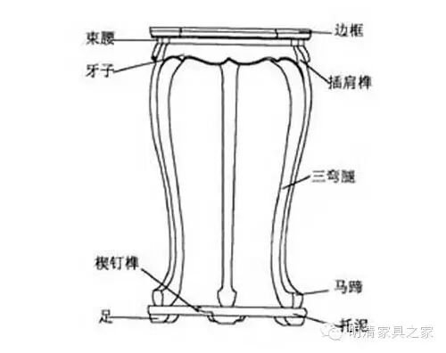 结构部件的使用大多仿效建筑的形式。如替木牙子,犹如建筑上承托大梁的替木。替木牙子又称托角牙子或倒挂牙子,家具上多用在横材与竖材相交的拐角处。也有的在两根立柱中间横木下按一通长牙条的,犹如建筑上的“枋”。它和替木牙子都是辅助横梁承担重力的。 角牙 清 黄花梨有束腰展腿式半桌 托角牙有牙头和牙条之分,一般在椅背搭脑和立柱的结合部位,或者扶手与前角柱结合的部位,多使用牙头,而在一些形体较大的器物中,如方桌、长桌、衣架等,则多使用托角牙条。除牙头和牙条外,还有各种造型的牙子,如:云拱牙子、云头牙子、弓背牙子、棂格牙子、悬鱼牙子、流苏牙子、龙纹牙子、凤纹牙子、各种花卉牙子等,这些富有装饰性的各式各样的牙子,既美化装饰了家具,同时在结构上也起着承托重量和力口固的作用。 圈口 圈口,圈口是装在四框里的牙板,四面或三面牙板互相衔接,中间留出亮洞,故称圈口。常在案腿内框或亮格柜的两侧使用,有的正面也用这种装饰,结构上起着辅助立柱支撑横梁的作用;常见有长方圈口、鱼肚圈口、椭圆圈口、海棠圈口。门圈口等,圈口以四面牙板居多,因其下边有一道朝上的牙板,在使用中就必然要受到限制,尤其在正面,人体身躯和手脚经常出入磨擦的地方,很少有朝上的装饰出现,因此在众多的家具实物中,凡使用这种装饰的,都在侧面或人体不易接触的地方,如翘头案腿间的圈口、书格两侧的亮洞等。 圈椅的壼门圈口 门圈口与以上所说略有不同,通常所见以三面装板居多,四面极为少见。壶,本意指皇宫望的路,门,只皇宫里的门。它和其他各种圈口不同的是没有下边那道朝上的牙板,也正由于这一点,它不仅可在侧面使用,而且在正面也可以使用。 档板 黄花梨翘头案中的透雕挡板 档板,档板的作用与圈口大体相同,起着加固四框的作用。其作法是用一整块木板镂雕出各种花纹,也有用小块木料做榫攒成棂格,镶在四框中间,发挥着装饰与结构相统一的作用。 绦环板 明式家具束腰上几种常见绦环板 绦环板,是在竖向板面四边的里侧浮雕一道阳线,板面无论是方,还是长方,每边阳线都与边框保持相等的距离。在抽屉脸、柜门板心、柜子的两山镶板、架子床的上眉部分和高束腰家具的束腰部分,常使用绦环板这个部件。绦环板的上下两边镶入四框的通槽里,有的在桌子的束腰部分使用绦环板,桌牙通过束腰部位的绦环板和矮柱支撑着桌面。从整体分析,采用高束腰的目的在于拉大牙板与桌面的距离,从而也拉长了桌腿与桌面、桌牙的结合距离。这时桌牙实际上代替低束腰桌子的罗锅枨,从而进一步固定了四腿,提高了四足的牢固性。绦环板内一般施加适当的浮雕,或中间镂一条孔,也有的采用光素手法,环内无雕饰,既保持素雅的艺术效果,又有活泼清新之感。 罗锅枨加矮佬 铁力木官帽椅正面壼门为罗锅枨加矮老 罗锅枨加矮佬。罗锅枨不口矮佬通常相互配合使用,其作用也是固定四腿和支撑桌面。这种部件,都用在低束腰或无束腰的桌子和椅凳上。所谓罗锅枨,即横枨的中间部位比两头略高,呈拱形,或曰“桥梁形”,现在南方匠师还有称其为“桥梁档”的。在北方,人们喜欢把两头低中间高的桥用人的驼背来形容,称“罗锅桥”,因而把这种与罗锅桥相似的家具部件称为罗锅枨。在罗锅枨的中间,大多用较矮的立柱与上端的桌面连接。矮柱俗称矮佬,一般成组使用,多以两只为一组,长边两组,短边一组。罗锅枨的造型,在结构力学上的意义并不大,之所以这样做,目的是加大枨下空间,增加使用功能,同时又打破那种平直呆板的格式,使家具增添艺术上的活力。 霸王枨 霸王枨,霸王枨是装饰在低束腰的长桌、方桌或方几上的一种特殊的结构部件。形式与托角牙条相似,不同的是它不是连接在牙板上,而是从腿的内角向上延伸与桌面下的两条 穿带相连,直接支撑着桌面,同时也加固了四足,这样就可以在桌牙下不再附加别的构件。为了避免出现死角,在桌牙与腿的转角处,多做出软圆角。霸王枨以其简练、朴实无华的造型,显示出典雅、文静的自然美。 搭脑 搭脑,是装在椅背之上,用于连接立柱和背板的结构部件,正中稍高,并略向后卷,以便人们休息时将头搭靠在上面,故称搭脑。其两端微向下垂,至尽头又向上挑起,有如古代官员的帽翅,这种造型属四出头式官帽椅。南官帽椅的搭脑向后卷的幅度略小,还有的没有后卷,只是正中稍高,两端略低,尽端也没有挑头,而是做出软圆角与立柱相连。 扶手 扶手,是装在椅子两侧供人架肘的构件。凡带这种构件的椅子均称为扶手椅。.扶手的后端与后角柱相连,前端与前角柱相连,中间装联帮棍。如果椅子的前腿不穿过坐面的话,则须另装“鹅脖儿”。扶手的形式多样,有曲式,有直式,有平式,也有后高前低的坡式。 托泥 托泥,是装在家具足下的一种构件,形式一般随面板形状而定,有方、长方、圆及四、六、八角,梅花,海棠诸式,雕刻花纹的不多。托泥的使用也有个大体规律,一般曲腿家具使用较多,如:三弯腿圆凳、香几、鼓腿澎牙方凳等。托泥既对腿足起保护作用;也有上下呼应,协调一致,增加稳重感的效果。 屏风帽子 屏风帽子,是装在屏风顶端的一种构件,其结构对屏风的牢固性有重要作用,装饰性亦很强。屏帽正中一般稍高,两侧稍低,至两端又稍翘起,形如僧人所戴的帽子,故又称“毗卢帽”。
