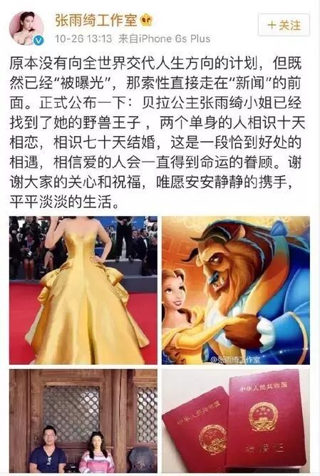 大喷子就是我,我就是大喷子,娱乐圈最近喜事真多啊,又有女神结婚了! 今天下午,张雨绮工作室正式公布张雨绮的婚讯,文字中透露张雨绮与爱人已经结婚,并对外界的关心和祝福表示感谢:“贝拉公主张雨绮小姐已经找到了她的野兽王子,两个单身的人相识十天相恋,相识七十天结婚,这是一段恰到好处的相遇,相信爱的人会一直得到命运的眷顾。谢谢大家的关心和祝福,唯愿安安静静的携手,平平淡淡的生活。” 张雨绮工作室选择今日公布婚讯,源于风行工作室今早曝光了一个张雨绮和爱人在上海生活状态的视频。 据张雨绮工作室了解到,风行工作室早前便收到关于张雨绮感情近况的爆料,为避免更多不真实消息的传播和有可能出现的不真实爆料,工作室决定主动公开真实情况。 张雨绮与现任丈夫 张雨绮的第一段婚姻,是与导演王全安,两人年龄相差21岁,是名副其实的老夫少妻,婚姻生活仅维持了4年多。 2014年9月,王全安因涉嫌嫖娼被北京警方当场抓获并拘留审查。 2015年7月这段婚姻画上句点,张雨绮宣布与王全安离婚。 此次婚讯一经公开,便获得网友纷纷祝福:“祝福女神!”“就知道你一定会幸福的!”圈姐是非常祝福张雨绮,但是还有些担忧,现任丈夫据说很有钱,新闻报道称上海汤城一品20万一平米的房子说买就买。(小助:但谁知道花的是谁的钱呢,也许是张雨绮自己买的呢。) 但随后张雨绮老公被曝料,曾于2010年涉嫌外逃,被当地人民法院挂出来过。所以闪婚一定要弄清对方底细,黄奕就是最好的反面教材,而且明明已婚有妻儿还说无婚史! 不管怎样还是希望张雨绮这一次不是冲动,而是遇上真心对她好的人。 祝福祝福~ 本文由娱乐圈头条(ID:yulemeiquan)整理发布 转载需授权,授权联系微信:lama129 [爆料有门]欢迎发邮至yulemeiquan@126.com 商务合作QQ:1900556960 | |