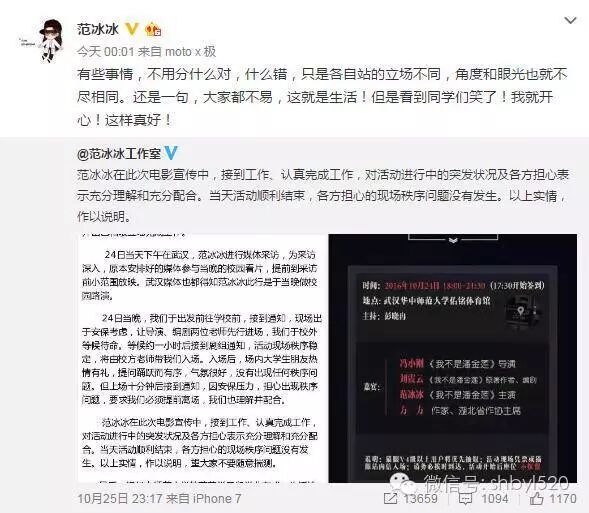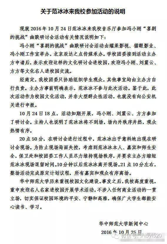 范冰冰 24日,范冰冰在武汉华中师范大学音乐厅参加电影《我不是潘金莲》的交流会时,突然被要求必须下台离开。10月25日,华中师范大学回应称是为了安全考虑。随后,范冰冰工作室也在微博发表声明,对活动进行中的突发状况及各方担心表示充分理解和充分配合,并当天活动顺利结束,各方担心的现场秩序问题没有发生。而范冰冰本人也转发工作室微博,再次表示大家都不容易,有些事情只是各自立场不同,不用分出对错。 平安武汉微博截图 华中师大声明截图 25日晚,范冰冰工作室官方微博发表声明,称:“冰冰在此次电影宣传中,接到工作、认真完成工作,对活动进行中的突发状况及各方担心表示充分理解和充分配合。当天活动顺利结束,各方担心的现场秩序问题没有发生。”声明中称工作室于三周前就接到了剧组的通知,并非所传“没有接到范冰冰到场的通知”。 26日零点刚过,范冰冰转发工作室微博,称:“有些事情,不用分什么对,什么错,只是各自站的立场不同,角度和眼光也就不尽相同。还是一句,大家都不易,这就是生活!但是看到同学们笑了!我就开心!这样真好!” 声明全文: 本工作室于3周前接到剧组通知,范冰冰小姐将于本月24日赴武汉和小刚导演、震云老师一起为新戏做校园路演。路演是电影宣传中的常规环节,演员需做到的是接到工作,并出色和敬业地完成工作。 24日当天下午在武汉,范冰冰进行媒体采访,为采访深入,原本安排好的媒体参与当晚的校园看片,提前到采访前小范围放映。武汉媒体也都得知范冰冰此行是于当晚做校园路演。 24日当晚,我们于出发前往学校前,接到通知,现场出于安保考虑,让导演、编剧两位老师先行进场,我们于校外等候待命。等候约一小时后接到剧组通知,活动现场秩序稳定,将由校方老师带我们入场。入场后,场内大学生朋友热情有礼,提问踊跃而有序,气氛很好,没有出现任何秩序问题。但上场十分钟后接到通知,因安保压力,担心出现秩序问题,要求我们必须提前离场,我们也理解并配合。 范冰冰在此次电影宣传中,接到工作、认真完成工作,对活动进行中的突发状况及各方担心表示充分理解和充分配合。当天活动顺利结束,各方担心的现场秩序问题没有发生。以上实情,作以说明。望大家不要随意揣测。 最后,祝华中师范大学的莘莘学子们学业有成,生活愉快。谢谢大家。 转自:凤凰娱乐 | |