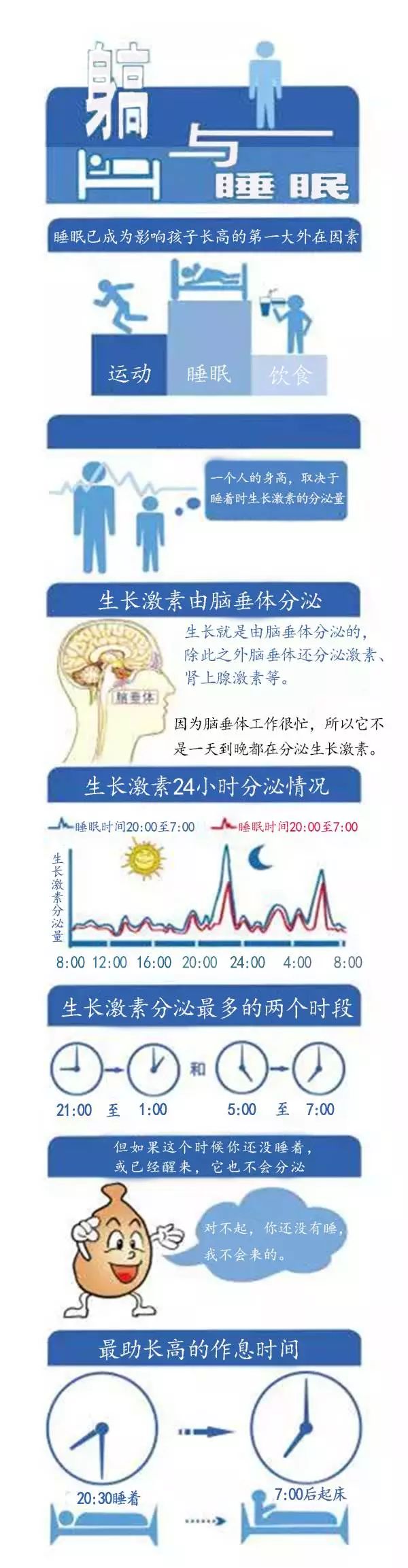 到底是怎么样的,我们用科学来说话吧! 孩子究竟要睡多少时间 我们看下面这张表 有研究表明,孩子的身高70%取决于父母基因,30%取决于后天。在这30%的外在因素中,睡眠对身高的影响排名第一,超出运动和饮食,因为在睡眠中会分泌出生长激素。 孩子到底几点睡才好呢? 我们再来看一张图 从图中可以看到,生长激素分泌最多的两个时段,分别是21:00-1:00,5:00-7:00,如果在这两个时间段内,你没有睡着,或者已经醒了,那么,你就错过它了。 生长发育专家为何如此注重孩子的睡眠? 规定小学时必须在8点半前上床?这是因为,睡眠是影响孩子身高最重要的外在因素。现在的孩子营养不缺,家长对锻炼也越来越重视,但唯独睡眠普遍不足。 从西医的角度讲,浙医儿院傅君芬主任医师说:“生长激素是影响人体身高的重要因素,而生长激素不像人体的其他激素在白天分泌,它是呈脉冲式分泌,主要在晚上分泌,分泌得越多,就越有助于生长。” 生长激素是由人的脑垂体分泌的。脑垂体一天的工作量很大,除了要分泌生长激素外,还要分泌性激素、促肾上腺皮质激素等人体所需的多种激素,因为“太忙了”,所以它并不是24小时都在分泌生长激素。只有婴儿期是个例外。 婴儿期时,不管是白天还是晚上,脑垂体在不断地分泌生长激素,所以1岁以前的婴儿,长得特别快。幼儿后,生长激素在白天的分泌量就非常少了,分泌量主要集中在晚上入睡时。 两个时间段对长高至关重要! 一个是晚9点至第二天凌晨1点,特别是晚上10点前后,生长激素的分泌量达到最高,可以达到白天的5-7倍。另外,早上6点前后的一两个小时,生长激素也有一个分泌小高峰。 不过并不是一到晚上9点,生长激素就开始按时大量分泌,它的大量分泌必须有个前提:只有在你深度睡眠时才会发生。如果你还没上床,或者已经上床但还没睡着,又或者已经睡着但还没进入深睡眠状态,那么它的分泌量就会大大降低。 所以睡得越迟,分泌的生长激素就越少,对孩子的身高越不利。而人一般在入睡后半小时至1小时,才进入深度睡眠状态。 所以生长发育专家的建议是:要孩子长得高,最好在晚上8:30前就上床,最迟不要超过晚9:30,并在早上7点以后再起床。 | |