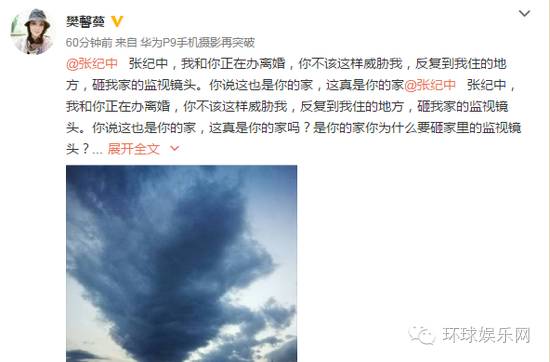 环环娱乐11月1日报道 日前,张纪中与樊馨蔓两人的离婚大战备受外界关注,事件已过去一段时间,10月31日,张纪中妻子樊馨蔓却深夜发文曝光其丈夫曾经反复上门威胁,砸坏监视镜头,更控诉其曾隐藏转移婚内财产。 樊馨蔓被曝出轨张纪中干儿子 8月30日,媒体曝出重磅消息称,导演张纪中的妻子樊馨蔓出轨其干儿子。对此,樊馨蔓当晚就召开记者会予以了反击,她表示张纪中养了“小三”,并当场公布了所谓“私生子”的照片。随后,张纪中声称妻子所言并不属实。 干儿子否认与樊馨蔓有染 随后晚间,张纪中干儿子肖齐公开否认与樊馨蔓有染,称人在做天在看,恶意诽谤他人只能成为笑话。而张纪中妻子樊馨蔓也表示出轨传闻为假,并称“这年头,做个正常的正派人,应该不难吧?凡给我打电话的记者,都邀请到了“绯闻地”。对不住、肖导,我无法沉默。继续努力,好好工作。” 樊馨蔓:为了6岁儿子,向张纪中讨要1.5亿家产 据媒体报道,9月6日,樊馨蔓不同意与丈夫张纪中协调离婚。为了得到张纪中手上的3亿夫妻共同财产,樊馨蔓准备9月底到法院起诉张纪中。樊馨蔓还表示早已聘请了律师对张纪中转移夫妻共同财产进行调查。 原文如下:张纪中,我和你正在办离婚,你不该这样威胁我,反复到我住的地方,砸我家的监视镜头。你说这也是你的家,这真是你的家吗?是你的家你为什么要砸家里的监视镜头?家里还有小孩啊?如果是你的家,从2009年开始,你都住在哪里?我找过你多少次?你剧组的人,你的很多朋友都知道我找你。既然你早就有自己的生活,放弃了家,你就不应该在为获取你隐藏更多婚内财产而威胁我,逼迫我,这都是什么年代了?我从来没有打扰过你的生活,哪怕你那么欺骗我。你很清楚警察也奈何不了你,但是你真的要这么全面暴露你自己吗?仅仅因为我自己在北京?你让你弟弟也来了我住的地方,他2010年上门来我就报过警,你知道我害怕你们。我希望你们尽快离开我住的地方。我们尽快依照法律程序办理离婚手续。我们已经不是在野蛮的年代,你也应该证明你是大家认识的大名鼎鼎的张纪中,应该依据法律办事,而不是威胁我让我回不来家。我坚持电影是我们团队三年来努力的结果,谁也拿不走。我也坚信所有的人都会期待引起这样轩然大波的电影到底是怎样的作品。你可以自己去拍,证明自己确实有能力也有才华。我在此发这个微博,就是希望连警察也奈何不了你的今天,如果我有危险,如果我的生活遇有不测,大家,我的朋友,应该知道是怎么一回事。 对不起关注我的朋友们了生活本来很美好,婚姻坏了就坏了,但是人身安全受威胁就没有安宁了。原本的生活就是自得其乐可以工作,可以看书,可以与朋友喝茶谈创作,但是就这么被过成了笑话。打扰了大家!希望吃瓜的群众都能够有比我安宁的生活。 | |