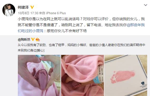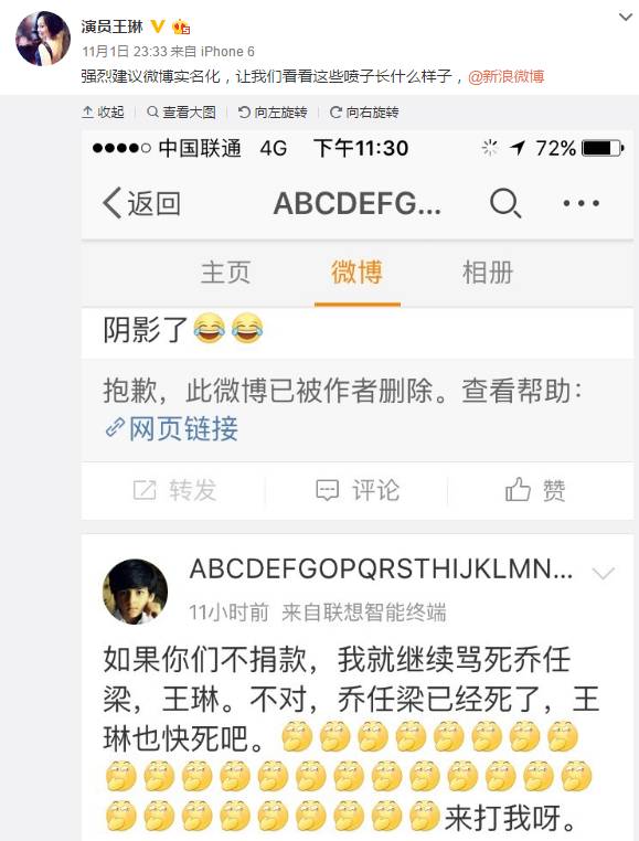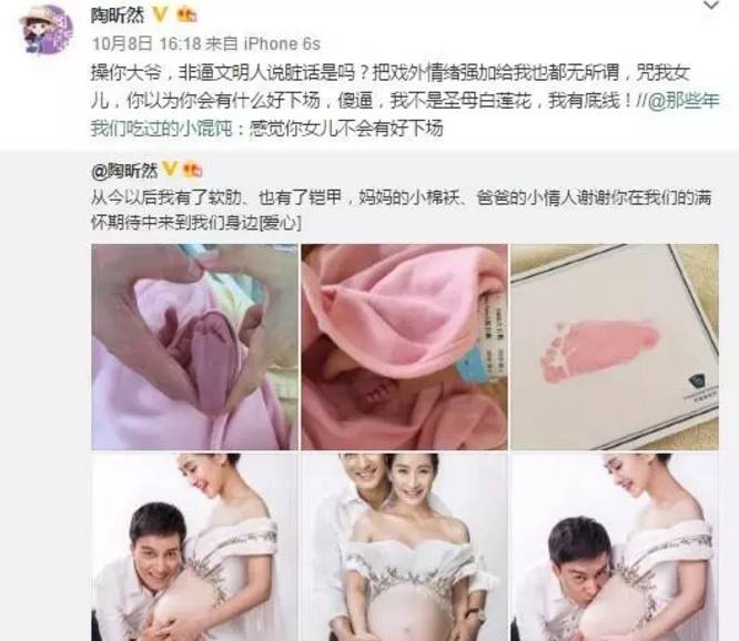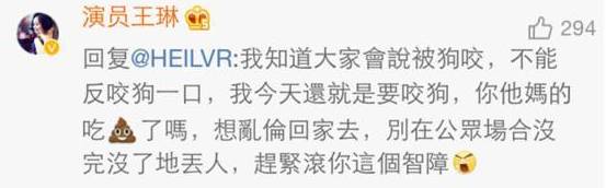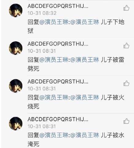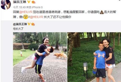 前几天,演员王琳在微博上晒出和儿子的合影近照,感慨儿子长大了,只见当年的小萌娃长大不少,已经能将妈妈抱起了。 而恰恰就是这两张有爱的母子合照,喷子却嘴下不留情,言辞不堪入目。 在评论里留下特别毁三观的言论:“长大了还不让他X你。” 此网友的不雅评论也惹怒王琳,毫不示弱直接挂出了该网友。 同时爆粗回骂:“我知道大家会说被狗咬,不能反咬狗一口,我今天还就是要咬狗,你他妈的吃SHI了吗,想乱伦回家去,别在公共场合没完没了的丢人,赶紧滚你这个智障。” 网友们都很支持王琳,纷纷评论“有事不要冲孩子”,“希望大家注意素质。” 可是,让人惊呆的是王琳回骂的这位网友,跟维护王琳的网友互怼起来↓↓ 11月1日晚,骂声没停,又有网友辱骂王琳的儿子,作为妈妈,王琳再次反击喊话:“草泥马,傻X你敢站出来吗?老娘跟你单挑,看看谁下地狱?” 不过,随后王琳删除该微博,最新的微博是挂出了该网友评论截图,并建议微博实名化,让大家都看看喷子长什么样子。 现在王琳已关闭了评论,眼不见心不烦。 王琳于2004年生下儿子,2005年末与丈夫和平分手,2011年王琳在访谈节目上大方坦承自己已离婚,儿子名字叫王若。 离婚后,王琳一直当单亲妈妈独自抚养儿子,定居在上海。 王琳和儿子感情很好,每次受访谈到儿子,王琳都是满脸幸福,王琳曾说如果没有儿子的话,那自己的生命完全是空的。 王琳很疼儿子,也很宠他。 王琳出国时,只有儿子会每天问:“妈妈你好吗,你在那里怎么样呀。” 无论塑造过多么人见人怕的角色,生活中的王琳绝对是十足的好妈妈! 王琳被很多人认识应该都是因为2001年《情深深雨蒙蒙》“雪姨”这个角色,演绎的太深入人心。 傲娇的白眼↓↓ 骂人都不带停顿的表情↓↓ 剧里的种种让“雪姨”成为“坏女人”的典范,到后来走不出剧情的不是角色扮演者,而是观众。 角色为她带来了名气,也带来了观众的戾气,一直被喷子惦记。 “同命相连”的还有《还珠格格》的容嬷嬷,从戏里被骂到戏外,几乎可以说是反派的巅峰,扮演者李明启老师演完角色后常遭人议论,让她不得不强调解释“我是好人,我姓李,叫李明启,是容嬷嬷那个角色不好,不是我本人不好!” 可是,你们不觉得给观众留下印象,也证明了她们演得好呀。 最近,选择亲自下场互怼网友的明星越来越多。 谢娜否认打压吴昕—— 陈学冬护粉丝—— 袁立否认陪睡—— 还有陈冠希冲冠一怒为红颜—— 像王琳这样,因保护孩子手撕网友的还有陶昕然夫妇、王栎鑫。 出演过《甄嬛传》安陵容的陶昕然,因为角色一直以来备受攻击,除了自己遭遇过被粉丝划车的经历,连父母都被骂过。今年9月陶昕然生下女儿核桃(何陶),升级为幸福的一家三口。 陶昕然在微博晒出女儿照片,之后却遭到网友咒骂“感觉你女儿不会有好下场”,被激怒的陶昕然公开爆粗驳斥:“操你大爷,非逼文明人说脏话是吗?把戏外情绪强加给我也都无所谓,咒我女儿,你以为你会有什么好下场,傻逼,我不是圣母白莲花,我有底线!” 陶昕然老公何建泽跟着发声:“小馄饨你是以为在网上就可以乱说话吗?对戏你可以评价,但你说我的女儿,我就不能管你是不是傻逼了,咱别网上说了,留下电话、地址我去找你。” 同样的事儿也在王栎鑫身上发生过。 今年1月,王栎鑫晒出女儿照片,但却有了很不和谐的声音。 导致王栎鑫在微博挂出一个网友,因为这个网友评论其女儿长得丑。 王栎鑫写道:“你可以说我家姑娘丑,这是你的权利,我不拦你,但其实你说她爹丑我就完全不会生气了,不要说我小气哈,我这当爹的你就多体谅一下哈,对不起了,小三同学!” 王栎鑫发出的照片中不仅有该网友评论的“真丑”,还有该网友的微博个人资料。 后来王栎鑫还是把那条微博删除了,又重新发了一条。他说“老炮儿里六爷说了,凡事儿都得讲个理儿,你们要讲理,我就跟你们讲理。你们要不讲,我还得跟你们讲,向来心善,但不被人欺。我常德人,常德德山山有德,我删,给我姑娘积点德。你们呢,也嘴上留点德,更要长点儿脑儿,我已经相当有礼貌和含蓄了,王大爷要真喷起来,可不是当年扔票那劲儿。” 哎…… 说句不好听的话简单粗暴没费什么力气,可是有的时候,给人造成的伤害却是核弹级别的,尤其是在攻击无辜孩子的时候。 戏只是戏,而生活就是生活! | |