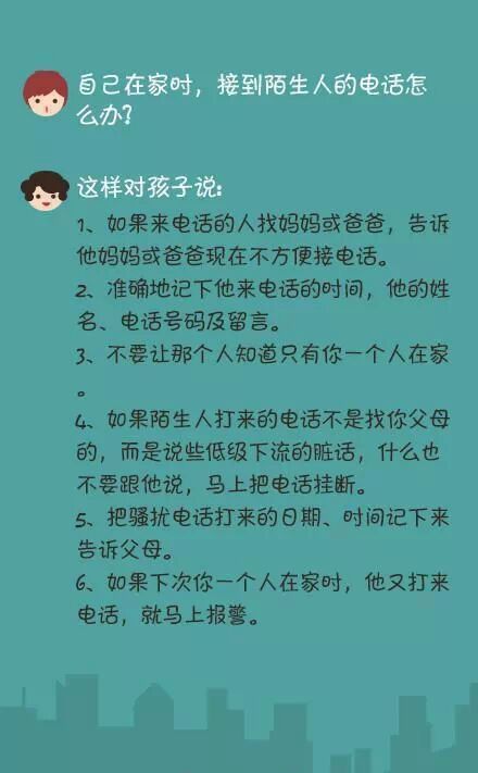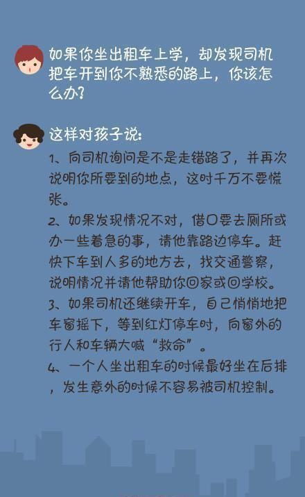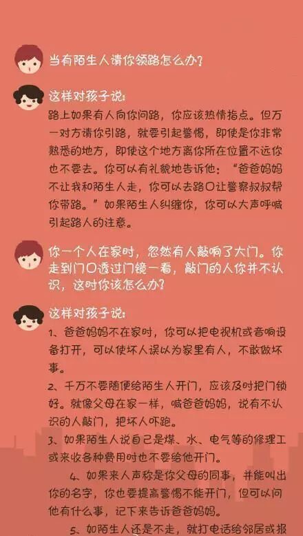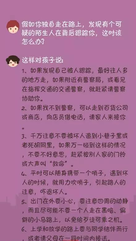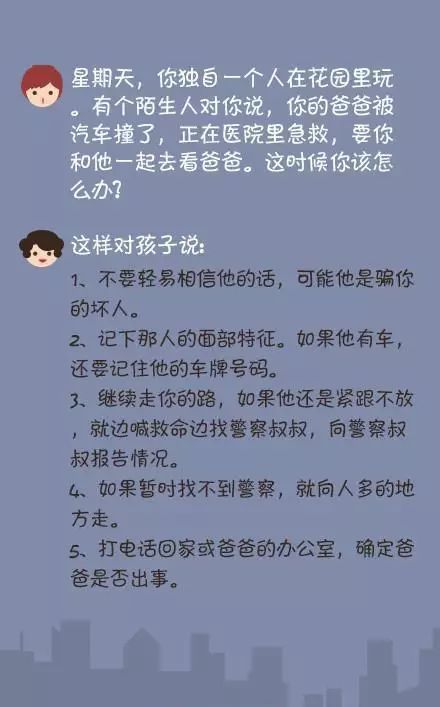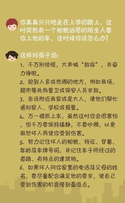 ①陌生人让你领路怎么办? ②一个人在家时有陌生人敲门怎么办? ③被高年级孩子“威胁”了怎么办? ④你独自在家里,有个陌生人和你说爸爸出事故了,带你去看爸爸怎么办? ⑤接到陌生人打来的电话怎么办? ⑥在上学路上,有陌生人要你上他的车怎么办? ⑦独自一人在路上,有陌生人跟踪你怎么办? ⑧如果坐出租车上学,发现司机把车开到你不熟悉的路上,怎么办? ⑨有陌生人请你吃东西怎么办? ⑩放学回家时发现家里呗盗窃了怎么办? 作为家长,不仅要在陪伴时呵护孩子的安全,更要教会孩子在独自身处险境时如何镇定应对。为了孩子的安全! 版权归原创者所有,如有侵权请及时联系! 每天为你分享有态度、有内涵、够犀利的人生小故事,把你从无趣的生活里拽出来。 觉得不错,请点赞↓↓↓ | |