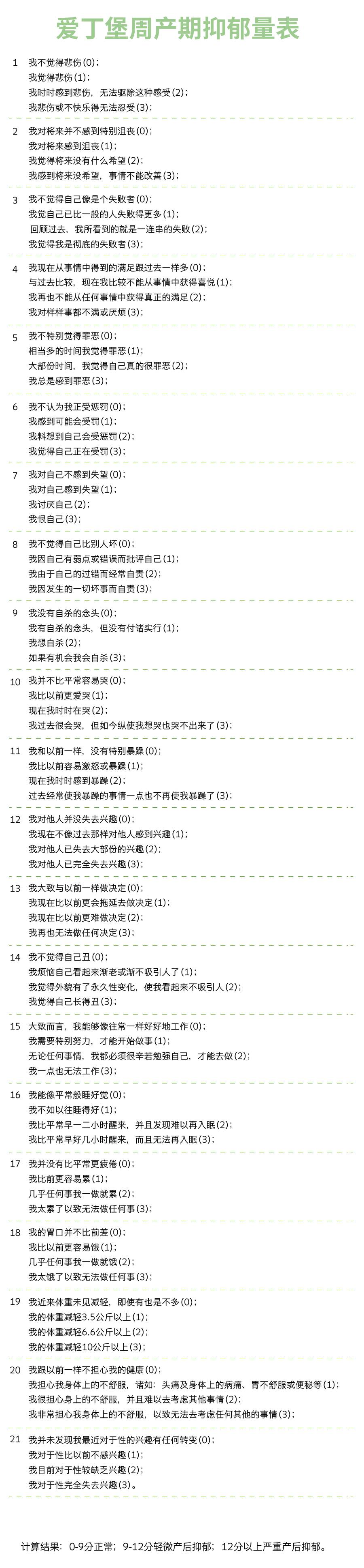 老公说我们没有经验,就把婆婆接到家里照顾我,谁知道这才是噩梦的开始…… 微信编辑器 构思编辑器 微信编辑器 构思编辑器 微信编辑器 构思编辑器 不让我洗脸刷牙,大早上就要喝一碗下奶汤,我自己说话都感觉能熏到自己了! 为了能直接照顾我们,晚上婆婆跟我睡,可是她晚上打呼噜,吵得我睡不好,我说让老公跟我一起住没有关系,就说我事多! 感谢婆婆帮我们洗衣服,可是尿布上还有粑粑和尿渍呢,就这样一起洗,我的衣服啊!!! 进我们的房间从来不敲门,上次跟老公亲亲还被看见了,丢死人了!!! 为了让我下奶,一直让我喝汤,啥都不让吃,只能偷偷吃,我都快神经衰弱了! 其实在宝宝出生后,宝妈们也需要受到跟孕期一样的照顾,这段时期很重要,如果不注意,很可能就会得可怕的产后抑郁。 微信编辑器 构思编辑器 微信编辑器 构思编辑器 什么是 “产后抑郁症”? 正常情况下,宝妈在卸货之后都会开心的不得了,看见宝宝内心就会涌起满满的幸福感。而患有产后抑郁症(Postpartum Depression, PPD)的宝妈却没有这种感觉,产后抑郁症其实是一种情绪障碍。 一般产后抑郁症可以在产后头一年的任何时间发病,发病率在10%-25%左右。它分为两种情况,一种是稍微轻一点的,也叫做产后情绪低落(Baby Blues),这种情况下的宝妈由于产后荷尔蒙的转变,会想哭、不安,情绪变化较大,但一般都会自己慢慢恢复。 还有一种情况比较严重,宝妈在产后由于激素的变化、角色的变化以及心理的变化等原因,除了会出现焦虑、失眠、情绪极度低落,还会有不想照顾宝宝、有负罪感、甚至还有伤害自己或者宝宝的想法,这种就需要及时就医了。 产后抑郁症的诱因1内分泌因素在孕期,宝妈体内的雌激素显著提高,生完宝宝后内雌激素水平会在极短时间内迅速下降到孕前的水平,这种激素变化可能会促使抑郁的发作。 2心理因素生产过程的辛苦、体力的消耗、荷尔蒙的变化再加上经验不足,不适应角色的转变使宝妈发生产后心理疾患的可能性变大。 3社会因素外部的条件也能增加产后抑郁的发生,比如家庭问题、经济问题、喂养问题等等。 4其他因素有既往的精神病史、生活中的压力、婚姻中的地位等等,都对产后抑郁发作有一定的影响。 一般在产后,医生们都会用爱丁堡产后抑郁量表来测试是否患有产后抑郁症,宝妈们赶紧收图吧! 不管是不是得了产后抑郁症,宝妈们最需要做的就是积极面对。当然了,菌菌也会给大家几个应对技巧,宝妈们赶紧学起来! step 1 坚持健康的饮食习惯: 就算再没有食欲,也要经常吃一点能帮助减压的、能给身体提供能量的食物,不一定要大补,最好是自己喜欢吃的,这样心情会更好。 step 2 锻炼和健身: 运动不仅能帮助恢复身材,还能帮助发泄情绪,对宝妈来说好处多多。 微信编辑器 构思编辑器 step 3 有足够的休息时间: 睡眠不足就会变得易怒,情绪波动也很大。如果晚上因为照顾宝宝睡不好,白天趁宝宝休息的时候补觉也是可以的,只有让自己好好休息,才会更有精力去照顾宝宝。 微信编辑器 构思编辑器 step 4 转移注意力: 当觉得难过或者有其他想法的时候,就看看书或者看看电视帮助分散注意力。 step 5 想法要积极: 遇见不好的事情时告诉自己:我生了一个全世界最可爱的宝宝,我是最棒的! 十月菌总结 如果宝妈在产后得了产后抑郁不必难过,这是很常见的,是可以治疗的。可以尝试着在觉得难过、不开心的时候跟家人、朋友敞开心扉的讨论自己的感受,这样才能让家人和朋友更加了解、体谅、关爱和帮助你。如果情况没有得到缓解,一定要及时就医,医生会帮助你的。 孕期护胎能力满级,卸货后你的通关奖励在这里 扫一扫,育儿有妙招! ↓↓↓ 可单手收车,可坐可躺,可以上飞机,可以全车拆洗,操作超方便的Hbr虎贝尔航空铝材质超轻便伞车正在开团哦,比双十一还划算,还等什么?快戳【阅读原文】购买吧! | |