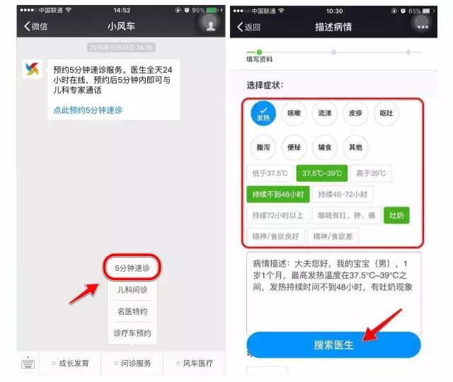 孩子一生病,全家都闹心,每次去医院都是人满为患,挂号难、排队难,好不容易轮到自家孩子,一着急病情描述不好,还没跟医生说上几句话,单子已经开出来了。 准确描述病情,让医生更快更直接地给出诊断,同时也避免一些不必要的身体检查,所以说带宝宝看病也是一门学问。 描述病情理重点,由一人说明就好 ① 回顾病史及疾病变化趋势,比如孩子是什么时候开始发烧的,是越烧越高还是越来越低,来医院之前有没有进行过治疗,在家有没有用药等。 ② 描述主要症状及孩子生活环境中是否有类似的疾病状况。 ③ 千万别七嘴八舌,人多啥都说不清。 不要用笼统的词,用数据客观叙述 在描述病情的时候,少用笼统的词,多用数据。 “老是、一直、好久、从来……” NO!对孩精确表述,比如:发烧一天半,昨天晚上10点开始。 客观的叙述要大于主观描述,如果只用你的标准来描述,可能让医生感觉这个事情拿捏不准,从而影响诊断效果。 有的家长做得非常好,自制了表格,孩子吃奶多少,体温多少,几点排便,大概什么状况,每天记一篇,包括宝贝的过敏反应。医生一翻看,用不着那么多语言,孩子基本状况就形成了。 看医生要带上病历和药物说明书 很多时候都需要复诊,最完美的情况是刚好挂到上一位医生的号,但这种情形太过理想化。 带上病历本和检查结果,之前吃药的空盒子也带上,以便复诊的医生诊断。 看病时医生说的话一定要仔细听,听不明白就问,直到弄清楚,特别是用药的剂量和时间。 描述疾病的自然变化和药物干预后变化 我们以发烧为例,自然变化指的是发烧过程,药物干预就是用了退烧药以后的体温的状况。 不仅要告诉医生孩子什么症状,还要告诉医生做了哪些药物干预,以及药物干预之后有哪些变化,最好是记录下来,把已做过的各项检查报告单及诊断、治疗方法提供给医生。 一方面供医生参考,另一方面也可避免重复检查,减少宝贝接受不必要抽血或X光线照射。 关注并描述孩子的一般状况 除了向医生介绍主要的症状外,宝贝的一般情况也要向医生说明一下,吃了几顿,吃了啥,精神状况如何,大小便情况及睡眠有无变化,吃喝拉撒睡代表着孩子的整体健康状况,详细表述。 还有最后一种常见状况,宝宝生病时在去医院的路上遇上堵车、路程太远、以及其他特殊情况不能直接去医院,这时候宝爸宝妈应该怎么办呢? 通过小风车,5分钟内就可以获得专业医生的电话帮助,解答爸爸妈妈的困惑,对宝宝的症状进行分析和护理指导,让宝贝少生病、不生病。 小风车的平台上都是北京三甲医院、美中宜和各院区儿科主任、主治医生等儿科专家。 只需微信轻轻一点,儿科医生极速回电,24小时在线的哦! 一、长按二维码找到“小风车”问诊平台 二、进入公众号菜单,选择“问诊服务”——5分钟速诊。 描述孩子病情、上传照片、系统自动匹配最合适的医生。 大约5分钟左右,就可以接到医生的电话进行一对一问诊了。 通过“小风车”微信公众平台,即可预约儿科问诊、5分钟速诊、营养咨询、心理咨询及移动诊疗车上门检查、检验、体检服务。 极速连线北京三甲医院儿科专家,在舒适的家庭环境里进行一对一电话问诊,在专业指导下护理宝宝常见疾病。宝宝健康,全家开怀! 小风车名医团队,由来自北京三甲医院、美中宜和各院区儿科主任、主治医生等儿科专家组成,他们拥有丰富的临床经验,用专业知识为宝宝提供更权威的诊断,为宝宝健康保驾护航! ▌推荐阅读: 饭后吃一物,大量排出体内垃圾!还能止咳润肺,神奇~ 你不让孩子吃苦,这个世界会让他很苦 这 5 种恢复免疫力的食物,你给孩子吃了吗? | |
