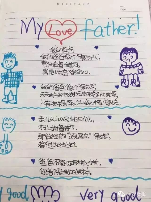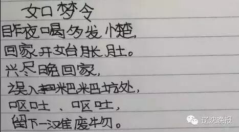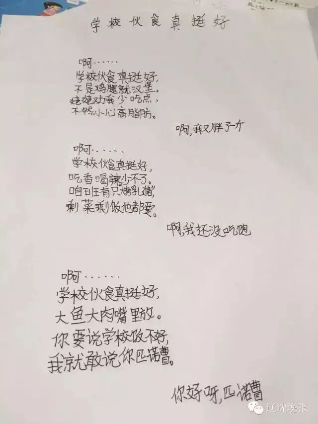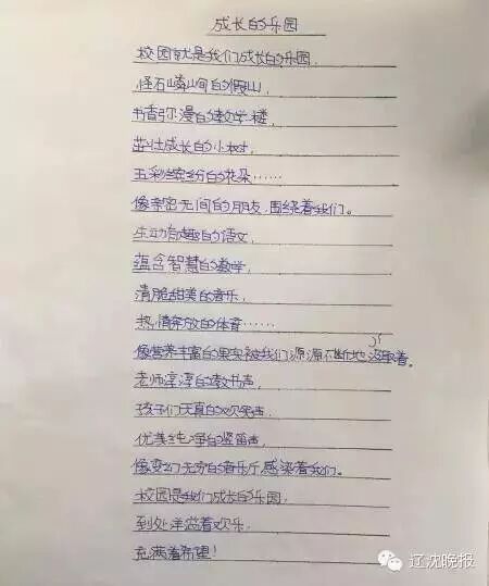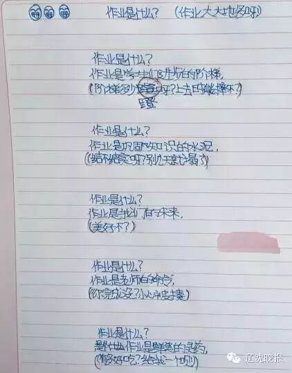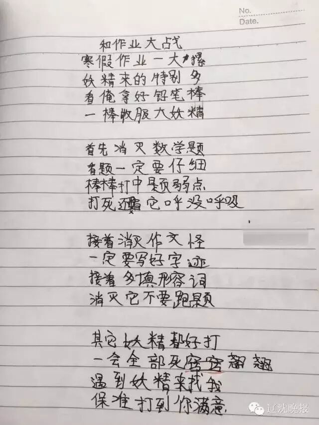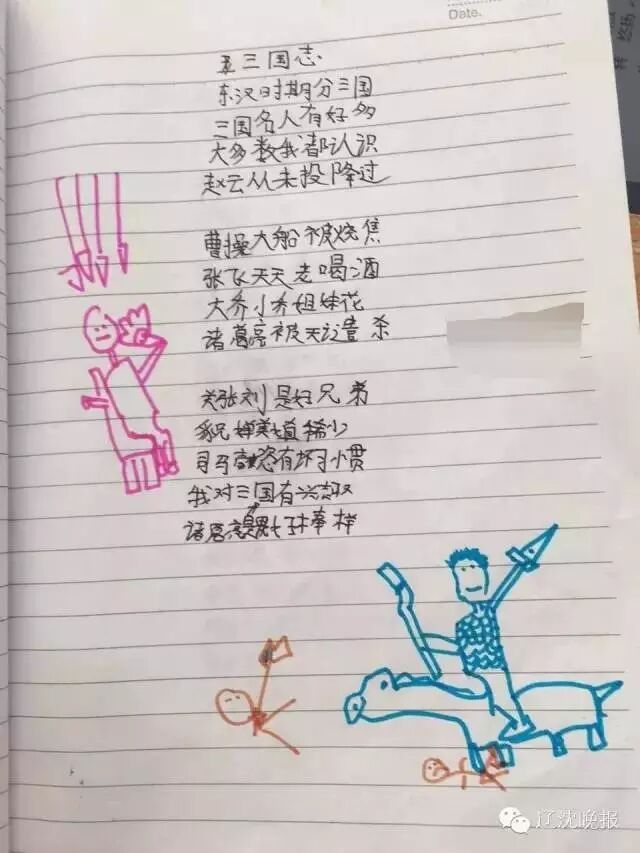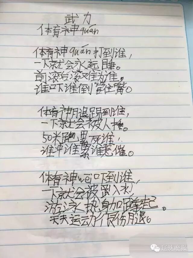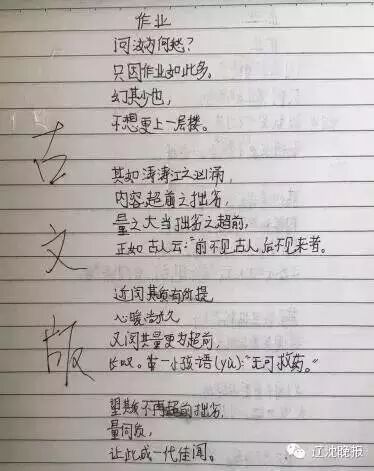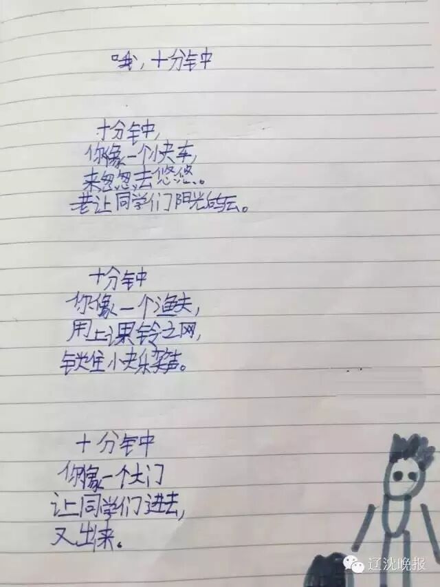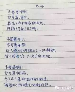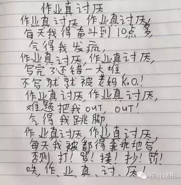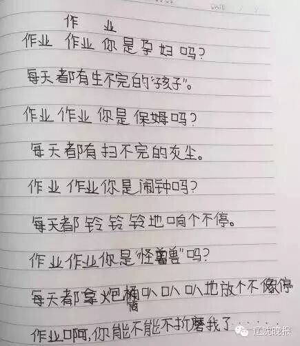都说诗歌源自生活 网上有一群10岁孩子的诗歌 刷爆了不少家长的朋友圈 原来,他们是沈阳铁西区启工三校4年级一个班的孩子们写的。 |- 幽怨的10分钟 -| 原来课间的10分钟 对于孩子们来说是无比幸福的一件事儿 十分钟太短,感觉好幽怨~ (点击图片可放大查看) |- 作业是孕妇吗 -| 作业,你说,你四不四孕妇? 作业,你就是妖精~ 不写作业会被老妈K.O 作业是怪兽,我要打怪兽 “前不见古人,后不见来者”孩子,你这句话用的~就不怕老师批评你哦? 孩子,你是高级黑啊~ |- 爸爸为啥叫愁 -| 爸爸在孩子眼里是啥? 好吧,是跟屁虫~是保姆 爸爸还有一种味道是愁~ 因为被妈妈训的 |- 冬哥哥淘气 -| 冬天啊,小伙伴虽然叫你一声哥哥 可好像似乎大概不稀罕你~ 只能说,关于春天 这俩孩子已经赢在了起跑线上~ 孩子们的成长 孩子们感受着成长,真好 |- 谁跑谁悲催 -| 孩子,感觉你对体育课的恨已经强大了你的文学造诣~ 50米跑累死谁? 谁冲谁跑谁悲催! |- 小心脂肪高 -| 学校食堂,孩子们很喜欢。 姥姥劝我少吃点 不然小心脂肪高 你要说学校饭不好 我就敢说你匹诺曹 |- 误入粑粑坑处 -| 不说了,脑洞大开的孩子 这孩子一定是饮料喝多了 |- 张飞老喝酒 -| 孩子很是认真的读了三国 总结的很是中肯吗 张飞天天老喝酒,你说得对 好吧,篇幅有限,让这位小朋友你告诉你结束的含义 下面 6 篇文章估计你也喜欢 ↓↓↓ 001:没有考试,寒门还能拼什么? 002:孩子,你的努力,就是你将来的路 003:即将到来的阶层社会-教育分层 004:我的孩子,这才是我送你出国背后的真正用意 005:写给我们这一代“无比焦虑”的父母们:流行的谬误把我们搞得太累 006:普通人家的孩子逆袭富二代,平均要花300年 长按本页底部二维码识别关注,回复文章数字编号,即可阅读。 幼儿园 | 幼升小 | 小升初 | 中考 | 高考 | 政策 | 资源 | 育儿 内容精选自:辽沈晚报 版权声明:我们尊重版权,转载已注明来源,如反对转载,请联系删除。详情请点击版 权声明和原创声明。 | |