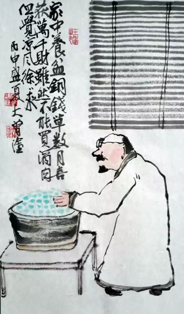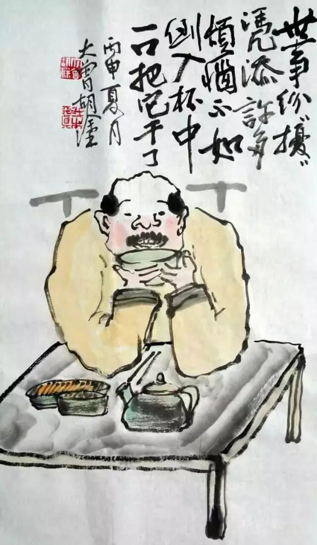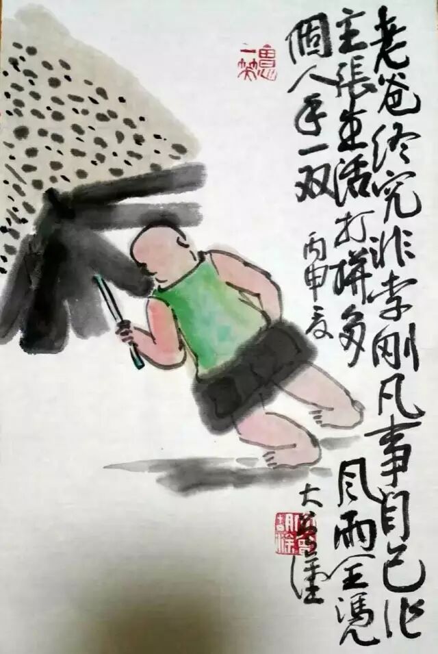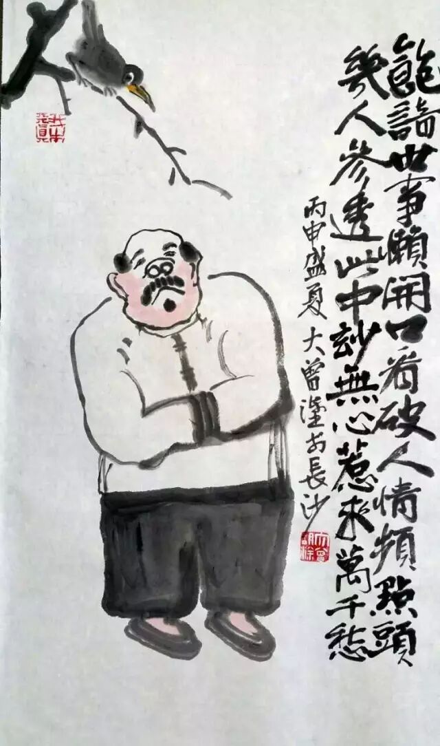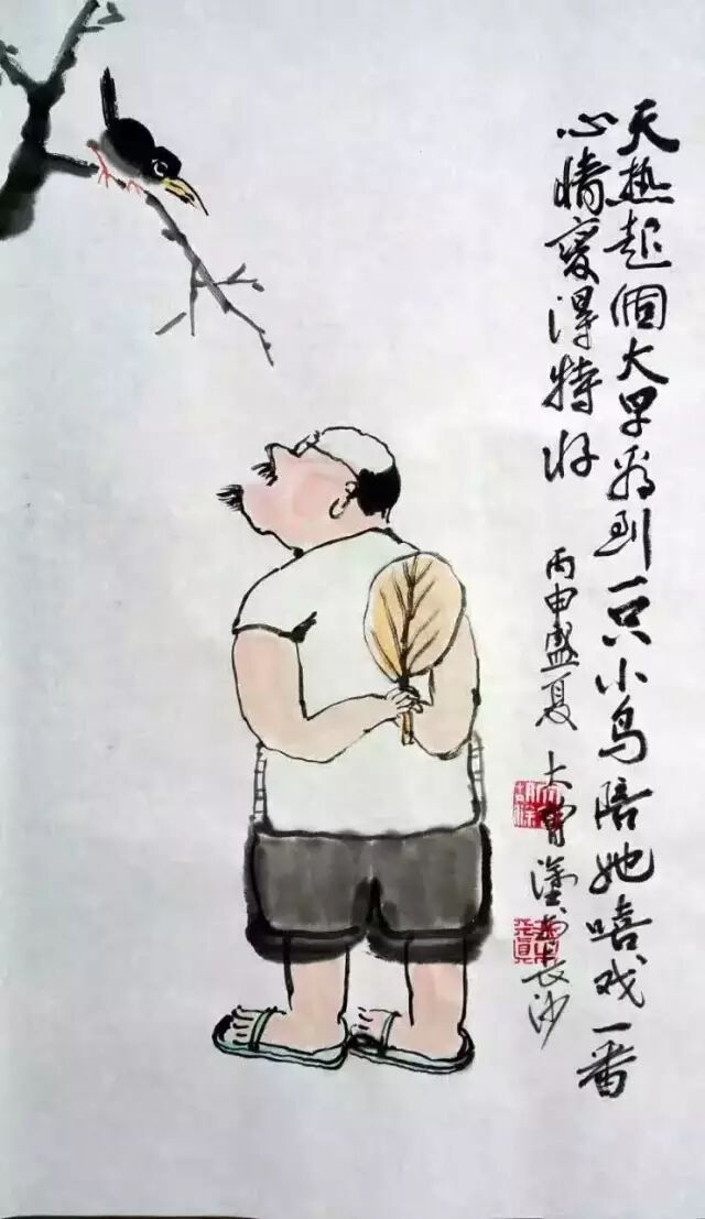 天热起个大早,看到一只小鸟。 陪她嘻戏一番,心情变得特好。 午梦醒后又发呆,梦里新婚爽歪歪。 忽听隔壁狮子吼,急忙应声我就来。 饱谙世事懒开口,看破人情频点头。 几人参透此中妙,无心惹来万千愁。 七月酷暑思西瓜,人人都想好瓜呷。 尝遍天下瓜无数,最忆儿时在老家。 家中养盆铜钱草,数月喜获万千财。 虽然不能买酒肉,但觉凉风徐徐来。 欲给姐姐捎信,许仙不在我境。 如此水漫金山,只是苦了百姓。 人比黄花瘦,只因饭不够。 失意须纵酒,喝了啥都有。 老爸终究非李刚,凡事自己作主张。 生活艰辛多风雨,全凭个人手一双。 世事纷纷扰扰,凭添许多烦恼。 不如倒入杯中,一口把它干了。 一个老头一个伴,一把茶壶一把扇。 几个小孩围拢来,先讲隋唐后讲汉。 赤日炎炎似火烧,绿荫掩映暑气消。 老猫作伴昏昏睡,梦里偷偷思阿娇。 大曾 ,曾初良,也乐斋主,湖南湘乡人,六十年代人。喜作文人画,常题打油诗,不求功与名,但得趣与乐。 他的画,寥寥几笔,把传统笔墨与现代元素巧妙结合在了一起。与画面相配的一首首率性而肆意调侃的打油诗,读来令人称快! 每分钟都有人在制作相册,你也来吧! | |