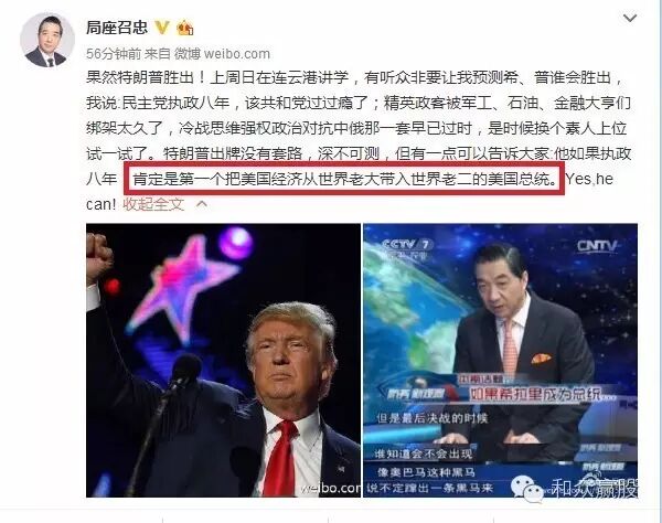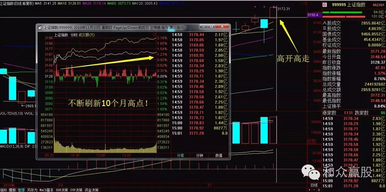 A股早盘也趁势高开高走,开盘就站在5日均线之上,之后全天更是高位运行,仿佛昨天的急跌都不存在,一路刷新前期高点,最终以收涨1.37%结束一天交易。 量能方面,两市合计成交量突破6500亿元,一副量价齐升的美好景象;板块方面,几乎全线飘红,反而是避险的黄金概念出现下跌,看来是昨天的行情已经把风险释放的差不多了,市场上的畏险情绪有所降低,市场热情有了明显改善。 此外,今天的高开提升了短线资金的成本,获利空间有了一定压制,获利出逃的动力略微不足,所以短期大盘上冲的压力不会太大,明天或者下周向上再冲一波的概率也很大。 不得不说,大盘还是有些气运的。今年只剩下不到两个月的时间,惯例的跨年行情迎来重要时间窗口,昨天的黑天鹅算是“瞌睡时的枕头”,多头正考虑利用什么借口洗筹吸筹时,天上掉下来一个特朗普。 自从年初熔断之后,大盘已经在大底部盘亘了近10个月,在市场经历过一次这样集中的空头动能释放后,水滴认为,本次黑天鹅极有可能成为行情启动的催化剂。 当大多数人还在网上转发各种美国大选的段子时,水滴提醒朋友们关注一个重要的经济指标:10月份CPI数据重返2时代,结合央行刚刚发布的今年第三季度货币政策执行报告,说明中国经济已经出现探底回升的征兆。 可以佐证的是,海外市场纷纷上调中国四季度GDP增速预期,预期全年经济增速有望保持6.5%-7%,说句不客气的大话,放眼全球,谁与争锋! 这种基本面利好对股市有着全方位本质的影响,相信朋友们也都了解,水滴也就不多说了,水滴想告诉朋友们的是:但凡市场中出现突发性的黑天鹅事件,回头去看,皆是买点。 最后,水滴准备祭出“来自东方的神秘力量”、因果律武器的拥有者——局座召忠的忠告,你真的不能不信啊! 天佑中华家! 好了,今天水滴就和朋友们聊到这里,祝愿朋友们投资顺利!如果您觉得文章不错,记得多多分享和点“ZAN”哦! (本文内容仅供参考,不构成买卖依据,据此买卖股票风险自担。投资有风险,入市需谨慎。) | |