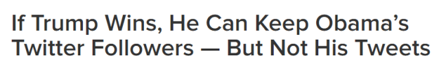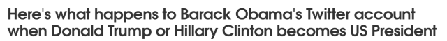 但这些年来,随着微博推特这些社交媒体的流行,那些什么首相总统在离职的时候,就必须要再考虑多一个问题了。。 那就是——当时注册的微博推特账号怎么处理?? 毕竟自己已经不是领导了,这么占着账号不行。。 但想带走吧。。又不让。。 最近的一个例子,就是卡梅伦的辞职了。。 当时,在卡梅伦辞职之前,他在微博上注册的账号,还是这样的。。 然而就在他正式离职后,这个账号立马第一时间就变成这样了。。 这个社会,就是这么现实。。咳。。 在今天,这个问题的讨论又出现了。。这一次是换成奥巴马了。。 随着美国总统选举的临近,奥巴马终于要卸任了。。接下来无论谁当选都没他什么事了。 但是中外网友的好奇心是一致的,在他要走的时候,很多网友都提出了一个问题: 奥观海同志,你当时写段子的那个推特号怎么处理?? 这是一个很严肃的问题,因为,这是一个有着1100多万粉丝的大号。。 奥巴马这两年来辛苦写的300多条推,好不容易吸引了这么多粉丝,就这么交出去,还是有点心塞的。。 而且这还不是问题重点。。 奥巴马一直明确表态支持希拉里当选总统,说她可能是史上最有资格的总统候选人,又和自己老婆米歇尔一直给希拉里拉支持。 这种情况下,如果希拉里能顺利当上总统并接手推特号最好,毕竟都是同一阵营的。 但如果到时是川普当选的话。。嗯。。这两人这期间是这样的。。 反正两人都很不爽对方就是了。。 不但这样,在奥巴马的美国总统这个推特号里,有很多顶希拉里踩川普的推文。。 例如这条顶希拉里的。。 “为希拉里感到非常自豪,昨天的辩论证明了她已经做好准备成为我们下一任美国总统了!” 例如这条疑似暗示川普不尊重女性的。。 如果到时账号由川普接手,情况就很尴尬了。。 ——我写段子的账号了,居然有损我的段子!! 而且,这种情况目前很有可能发生!!在前几天的FBI宣布重新调查希拉里的邮件门事件后,希拉里的人气直降,根据民调显示,川普的支持率自5月以来,首次反超希拉里。。 当前川普的支持率为46%,希拉里的支持率为45%,而最要命的是离大选已经不足一周时间了。。 现在总统宝座最后走向不明,推特号接手人也就不明了。。 要是真是川普接手——最讨厌的一个对手,居然特么最后要接手我辛辛苦苦发段子攒下来的有1100多万粉丝的微博账号!!! 想想也是心塞。。 在这种背景下,网友们对这个问题实在太好奇,于是,今天外媒各个文章就出来了。。 buzzfeed道出了大家最关心的重点: 如果川普赢了,他可以留下奥巴马的粉丝——但没办法保留奥巴马发过的推。 是的,到时新的总统上任,虽然可以继续用这个账号,但之前奥巴马在里面发的内容将会被转移到一个新的推特账号@POTUS44。新总统上任,接手的会是一个有1000多万粉丝的空白推特号。。 点进去看了一下,那个账号目前已经是被保护状态了。。 不但这样,目前的副总统,还有总统夫人,都有各自新的账号安排,估计推文到时都会被转过去。。 而且,如果到时是希拉里当选总统,那克林顿的头衔必然不能用现在第一夫人的账号了。。 如果希拉里当选,克林顿很有可能到时会被称为“first gentleman of the United States.”,“第一男士”“第一丈夫”, 第一夫人first lady of the United States缩写是FLOTUS,那么第一老公很有可能就是FGOTUS。 燃鹅点进去推特上这个@FGOTUS一看,结果发现官方没有收了这个账号。。 这个号2013年就被抢注了。。现在发了几条推,只有几百个粉丝。。里面账号主人估计当时想到了这一点,发的内容都是支持希拉里的。。 目前来看,官方没打算收了这账号。。 克林顿:你们都不为我打算下吗。。 其实除了推特账号,奥巴马还是第一个玩instagram,facebook,以及其他各种社交媒体的总统,要是账号都留着,可以再就业成为专业段子手了。。 这次的总统竞争各种互揭黑幕,斗得这么激烈。。这些账号会不会是诱因之一呢。。 毕竟。。 粉丝量这么多的一个账号。。 平时接接微商广告啥的,一年的收入都很乐观了。。 | |