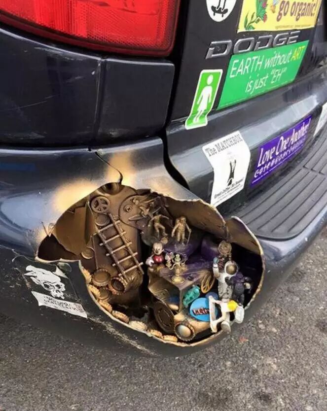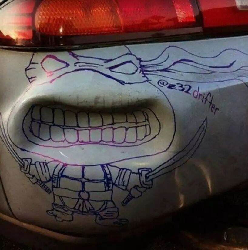 车坏了,动手能力强啊,瞬间童趣起来! 车凹进去还没修得那么快,一个涂鸦快速解决了! 与原来的比,你更喜欢用哪个换挡呢? 后视镜坏了,民间高手也能修好,看,这不挺有个性的嘛! | |