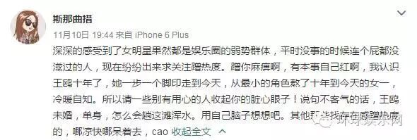 王鸥曾在《琅琊榜》中饰演秦般弱 环环娱乐讯 近日,某媒体爆料刘恺威和王鸥在新疆拍戏期间,接二连三深夜同房共处,虽然刘恺威回应“对剧本”,但诸多疑点惹网友怀疑两人关系不简单。11月10日,全明星探更在直播中爆料王鸥疑似早已结婚。微博名为“夏雨719”的网友曾在2012年10月28日,在微博上为王鸥送上生日祝福:“祝我的:兄弟媳妇嫂子姐,@王鸥Angel 生日快乐!我人生手捧玫瑰花的第一次给了你!由于某人他在外地拍戏无法同祝,我只能代表我的兄弟跟你说五个字:老婆,我爱你!其它的我真代替不了。”其中,一句“老婆,我爱你”让人难免引起猜测。 王鸥疑似已婚 而出演《余罪》大嫂的徐冬冬更在早前发文:“jian不是第一次jian了,三都不是第一次三了,还差这一次吗”,疑似暗指王鸥曾抢其男友。 徐冬冬微博截图 对此,自称王鸥好友的网友“斯那曲措”在网上发文力挺闺蜜,并怒斥徐冬冬借机蹭热度,她表示:“深深的感受到了女明星是娱乐圈的弱势群体,有些人找存在感,有本事自己红啊,蹭热度!”“那些找存在感,蹭热度的,哪儿凉快哪儿呆着去。” 疑似王鸥好友微博截图 对于王鸥是否单身,她表示:“王鸥十年了,她一步一个脚印走到今天,从最小的角色熬了十年到今天的女一,冷暖自知。所以请一些别有用心的人收起你的脏心眼子!说句不客气的话,王鸥未婚,单身,怎么会趟这滩浑水。” | |