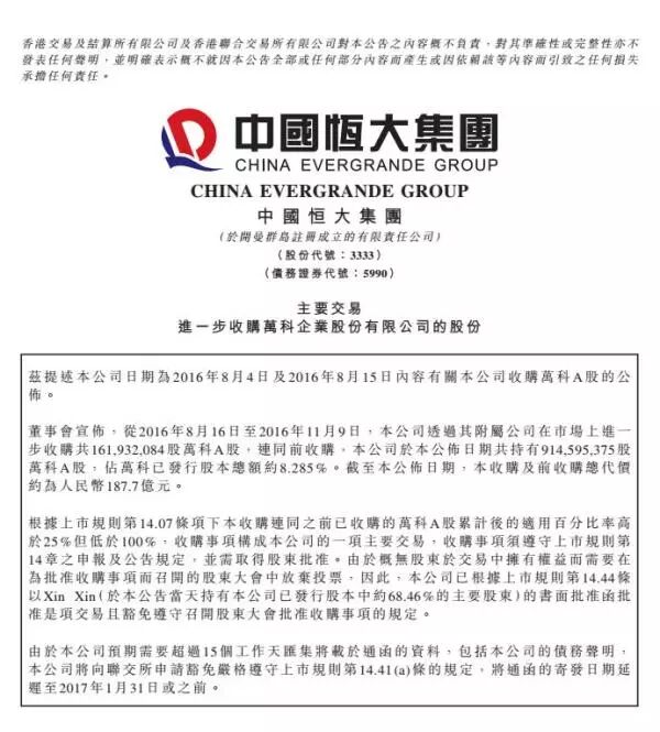 综合财经哥 上海证券报 澎湃等 这几天,川普意想不到赢得了美国总统,心情自然不错。 而远在中国的许家印,心情应该是复杂的:曾经有一份真挚的生意摆在面前,我没有珍惜,等我失去的时候我才后悔莫及,人世间最痛苦的事莫过于此。 是的,许老板和川总统之间只缺了一个推介会的距离。当然,许老板的眼光,我们是不得不服! 许老板可以的! 8年前就和川普结盟了! 这线儿放得够长 就问你服不服! 恒大帮女排选了郎平 帮男足选了里皮, 又帮美国选了川普。 许家印自传《我是如何改变世界的》。 11月9日万科涨停的原因也找到了 川普女儿叫Ivanka=爱万科 恒大持有万科股份或超10% 恒大早已和川普合作结盟 川普赢得美国大选 川普女儿叫Ivanka 爱万科 万科A涨停 A股股民是强大而富有想象力! 你没看错,许家印在8年前就与川普正式结盟。 原本是打算在中国主要超大型城市的顶级豪宅及超高层建筑领域上展开合作,当时是恒大总裁夏海钧签的约,签约时川普那个激动啊,连子女都带上了。 (夏海钧与唐纳德川普签约) 结果嘛,你懂的,2008年的许家印差点倒下。2008年上市失败后的许老板,找万科王石帮忙被拒,最终陪郑裕彤打牌三个月挺过难关。自身难保的许老板,和川总统合作的事情自然就不了了之。 八年后的今天,真的每个人都物是人非,今非昔比!这个故事告诉我们,一定要珍惜眼前人!如果上天再给王石一次机会,王老板或许会对许老板说三个字:没问题!而许老板一定会和川总统说三个字:我爱你! 双11许老板开启“买买买”模式 11月2日,我们曾经写过许老板在梅雁吉祥这支妖股上快进快出,割了一大笔韭菜的故事(点击阅读:清仓?恒大概念股集体惊魂 许老板割韭菜快准狠!)。 11月8日,保监会不干了,约谈了恒大人寿负责人:你恒大赚快钱的方式太招摇了!不能这么干! 恒大人寿相关负责人表示,将切实落实监管要求,着力杜绝类似行为发生。然而,隔了两天,恒大又着急买买买了:韭菜们,别怕,我又来啦! 11月11日,梅雁吉祥公告称,11月10日恒大关联方司仲勤投资买入9490万股,占总股本5%。 从9月30日持股达4.95%成为梅雁吉祥的第一大股东,至10月31日将其所持股份全部卖出,恒大人寿曾以“对资本市场和公司价值的判断”作为卖出理由。就在这次恒大人寿表示要虚心受教时,11月10日距离上次卖出仅十天时间,实际控制的公司又大举买入,投资目的也变成了“对水力发电行业领域的战略投资,并计划长期持有”。短短十天之前对公司态度天翻地覆,其用意究竟是什么? 不过,恒大时点是抓的极好。这十来天,股价大幅缩水了15%,高抛低吸,手段高明! 只是才反省了两天,又发力,动作之快让韭菜们傻了,就连上交所也看不懂了!于是,11日上交所对梅雁吉祥实施紧急停牌,并迅速发声,问询函抛出五个方面的问题,包括“恒大系”的投资逻辑、决策评估、资金来源、后续安排、幕后接洽,核心直指其举牌梅雁吉祥的真实意图。 上证所称,恒大人寿减持公司股票信息披露后至仲勤投资 11 月 10 日增持,公司股票下跌约 15%。“请仲勤投资及其实际控制人具体说明,仲勤投资短期内再次买入公司股票的主要考虑和目的,并结合前期恒大人寿增、减持公司股票情况,解释两公司短期内就梅雁吉祥股票连续发生多次不同方向交易的原因及其合理性,相关投资决策是否存在前后关联。” 由于保监会曾公开披露约谈恒大人寿,上证所再问:“请仲勤投资及其实际控制人具体说明,仲勤投资在此情况下再次买入公司股票,是否考虑其关联企业恒大人寿的前述表态,是否评估买入行为对公司股价和投资者预期的影响。” 另外考虑到仲勤投资仅为恒大多层持股的子公司,上证所质疑:“请仲勤投资具体说明其本次买入公司股票的资金来源,并核实相关资金是否与恒大人寿有关。” 由于形成了实质性举牌,上证所问恒大“是否有意通过股份增持获得梅雁吉祥的实际控制权,是否有意参与梅雁吉祥的经营管理。”并直接要求:“请仲勤投资明确披露未来 12 个月是否拟增持公司股票,如拟增持,请补充披露最低增持数量和增持价格。” 此外,上证所还向要求梅雁吉祥说明是否与仲勤投资及其关联企业有过接触或洽谈,包括但不限于未来第一大股东变更、董事会成员调整、公司生产经营安排等方面的内容。 上证所最后要求梅雁吉祥及仲勤投资应当在 11 月 16 日前召开现场投资者说明会,公司主要负责人及相关人员、仲勤投资及其实际控制人(或其授权代表)应当参会,回答投资者关心的问题。 值得注意的是,在当天梅雁吉祥公布的恒大持股名单显示,恒大在11月9日港交所公告披露后再次买入万科A,目前持股已经达到了8.95%。原来,恒大还在暗中对万科A买买买! 与其他几个“准举牌”股票不同,恒大买入万科只进不出,而且成本越来越高,根据恒大此前的披露信息,恒大在8月14日至11月9日买入万科的股份均价已经达到了26元。由此,在万科身上,恒大累计砸下超过187.7亿人民币,截止最新收盘价25.99元,恒大浮盈超过52亿。 恒大表示,因为看中万科财务表现强劲,所以此次收购为公司的投资。 此前根据港交所最新数据显示,许家印两位“牌友”中渝置地(01224.HK)主席张松桥的力信资本持有万科H股1.5亿股,占万科H总股本的11.54%;新世界集团郑家纯家族持有万科H股5.96%。根据万科H股占整个万科流通股的11.91%计算,上述二者共持有万科总股本约