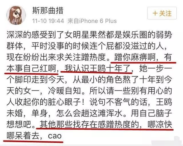 大喷子就是我,我就是大喷子,今天请叫我剁手剁不停,吃土根本停不下来的圈姐!马云真是一个让人欢喜让人忧的男人!呜呜,败家老娘们的罪魁祸首~ 双11的狂欢气氛还没散去,圈姐就已经燃起了八卦之心,最近闹得沸沸扬扬的刘恺威出轨事件,具体怎么回事大家应该都知道了,详情戳蓝色链接:刘恺威深夜幽会王鸥四小时,难道杨幂刘恺威真的婚姻破裂了?! 因为这件事,王鸥被推倒风口浪尖,当然也被网友各种扒皮,上了好几天热搜了都。 于是关于她的各种黑历史也就浮现在大家面前,首先是被质疑整容。王鸥是从CCTV模特大赛开始进入演艺圈,参赛期间长这样。 泳装是这样,有点犀利啊。 而时光飞逝,一点一点精雕玉琢,她变成这个样子。(小助:精雕玉琢?不是手术刀雕刻?) 其次怀疑她年龄作假。参加央视模特赛的时候,央视官方说的是21岁,比赛在2003年,倒推出生年龄为1981年。 但很意外的是,在王鸥并没有出名的时候,有热心网友回答说她是76年的。而且2015年以前,网友的回答都是76年,15年以后,回答变成了82年。 现在女明星红了之后改年龄的很多,王鸥到底是80后还是70后估计只有警察蜀黍知道了。 而最最劲爆的是,王鸥被曝是个惯三。饰演《余罪》中大嫂的演员徐冬冬在卓伟曝出俩人幽会当天,发了一条耐人寻味的微博而后又秒删。微博内容大意是某人当小三已经不是第一次。 《余罪》 具体怎么回事呢?原来当初徐冬冬和好男儿蒲巴甲是一对,之前还被拍到蒲巴甲向大嫂单膝跪地献花的照片,大家都以为俩人要修成正果了。 然而却曝出王鸥和蒲巴甲亲密互动,而徐冬冬也暗指和蒲巴甲分手是因为王鸥的介入。 没错,这次也是两人合拍电视剧的时候。 被曝是惯三后,也有王鸥的朋友出来为她说话,斥责徐冬冬出来蹭热度。 不过网友的评论是这样的。 王鸥一路走来不容易,演技也还不错,这次出轨风波,杨幂选择相信,刘恺威矢口否认,王鸥似乎有点身败名裂了。呜呼~ 最后说实话国产的这些粗制滥造电视剧,都辣眼没法看,剧本还能有啥好探讨的? 希望刘恺威多多人家张伦硕 本文由娱乐圈头条(ID:yulemeiquan)整理发布 转载需授权,授权联系微信:lama129 [爆料有门]欢迎发邮至yulemeiquan@126.com 商务合作QQ:1900556960 | |