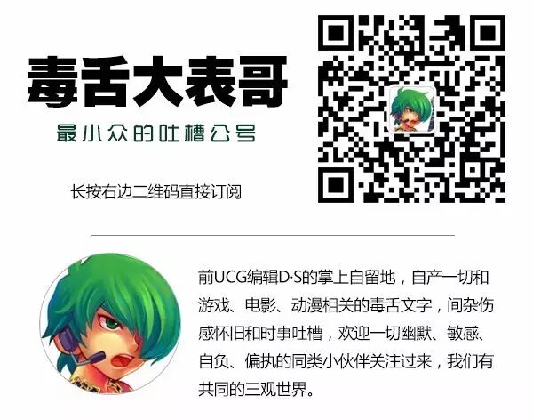 前UCG编辑D·S的掌上自留地,自产一切和游戏、电影、动漫相关的毒舌文字,间杂伤感怀旧和时事吐槽,欢迎一切幽默、敏感、自负、偏执的同类小伙伴关注过来,我们有共同的三观世界。 微信号: