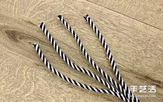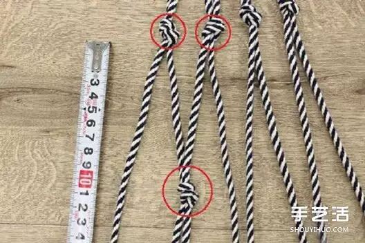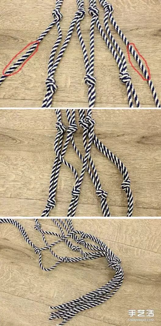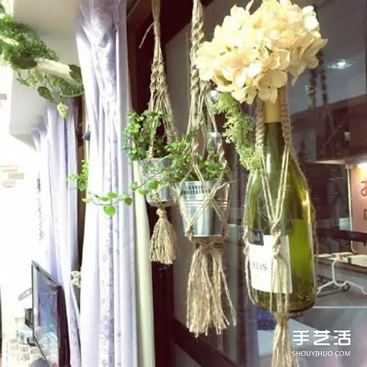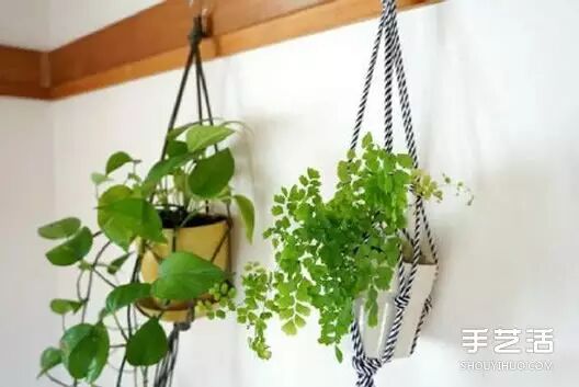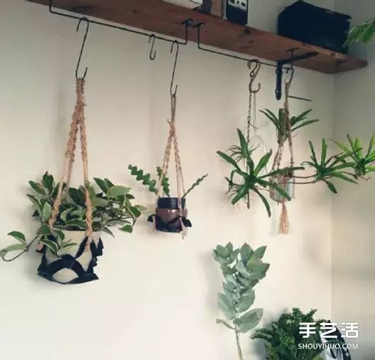 利用绳索将植物盆栽悬挂起来,既可以节省空间,也是很不错的装饰。分享一种打绳结的方法,可以让盆栽稳当的挂在空中,有需要的小伙伴一起来跟着学吧~~~ 准备粗一点的绳子,保证安全。还需要另外准备一个金属圆环。 做法有点类似立夏茶叶蛋编织袋制作。 也可以把酒瓶、铁罐等等拿来废物利用。 简单小手工,让生活更美好! | |