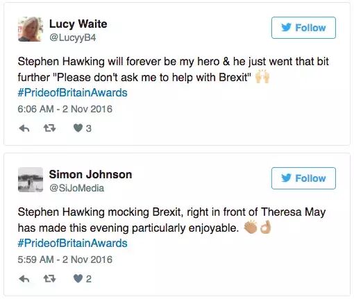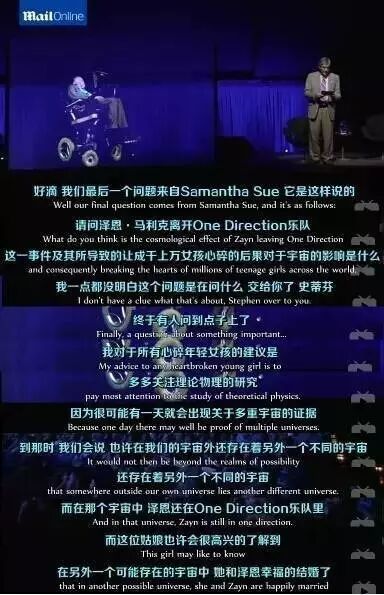 近日,霍金在英国拿了一个奖:英国骄傲奖的终身成就奖。 这是个很重量级的国家奖项,旨在鼓励那些对英国社会有杰出贡献的人,每次直播都有千万人守着电视等着看。 不仅奖项很国家重量级,颁奖人也是。此次的颁奖人正是英国首相特雷莎·梅。 梅姨在颁奖词中说:“他是一个了不起的人,他无疑是我们这个时代最鼓舞人心的科学家之一。” 然后霍金当着全英国观众的面说:“首相大人,感谢您说这些客气的话。我每天都要应对各种困难的数学问题,请不要再让我解决脱欧的问题了。” 蜜汁微笑 梅姨内心OS:好气哦,但还是得保持微笑。 为什么要怼梅姨,因为对于英国脱欧这事儿,霍金是拒绝的。今年3月,霍金曾和一众科学院士联名写信发出警告:脱欧将给英国科学界带来一场“灾难”。 但是结局,如此sad,英国还是脱了欧。 网友表示:“霍金永远是我的英雄。”,“霍金在特雷莎·梅面前怼脱欧让今晚变得特愉快。” 反正,霍金就是物理界的顶级段子手。 比如贝克汉姆和他的妻子去拜访霍金的那次,霍金说:“我和你总是作为英国象征被比较一番,却难分高下。” 图片源自网络 再比如关于平行宇宙的问题,他是这么回答的。 图片源自网络 还有去年霍金在悉尼大剧院出席活动,当时他被问到了一个脑洞清奇的问题。 图片源自网络 再比如关于“人工智能危险性”的这个问题,霍金曾在一次和JohnOliver的对话节目里,对这一问题表达了看法。 霍金说跟机器人作战,你会输得很惨。John Oliver不信邪,说机器人有啥了不起,打不过的话拔掉插头它就歇菜了。 于是霍金就跟他讲了一个故事。 厉害了Word霍金教授! 总之,霍金教授就是这么可爱又迷人的角色。 | |