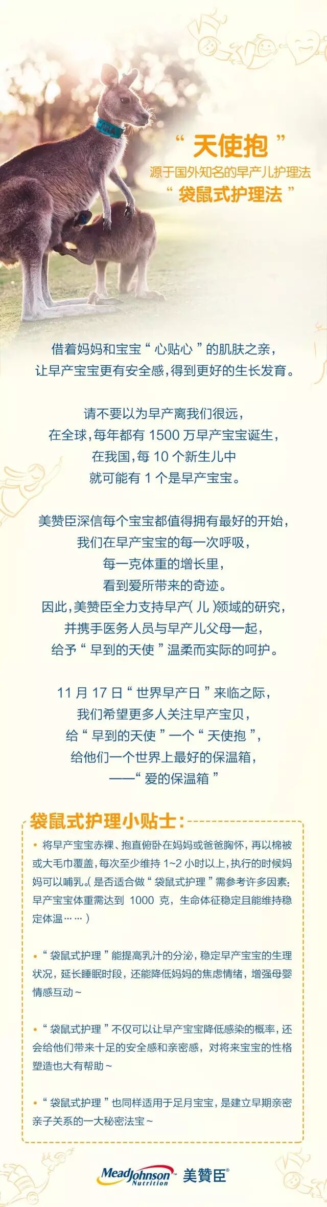 (以下文章转自于美赞臣中国官方微信) 明天是11月17日,也是世界卫生组织呼吁的“世界早产日”,期待能有更多人了解“袋鼠式护理法”,关注早产现象,愿我们能一起给早产儿及其家庭更多温暖陪伴。 | |