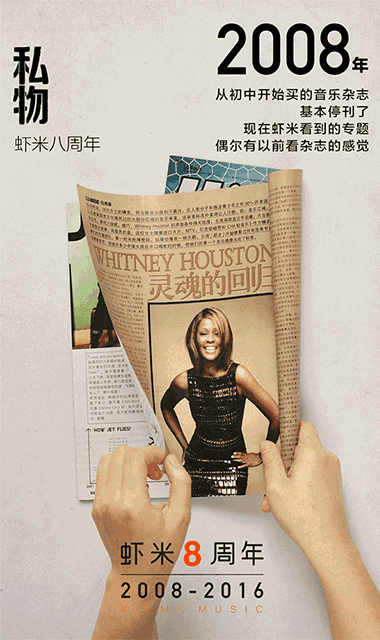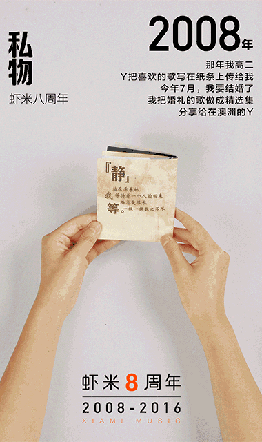 已经停刊的音乐杂志 当初省吃俭用买的珍贵唱片 曾经迷恋的偶像的海报 这些音乐私物就是你我的音乐故乡 音乐需要方便,更需要仪式 如果没有音乐,生活可能就是一个错误 明天,就是虾米八周年 8年,2848天的坚持 谢谢你们一直的支持和陪伴 有情有义,欢天喜地 你和虾米又有什么样故事呢? 虾米八周年,倒计时一天 明天,记得打开你的虾米APP哦! 么么哒! | |