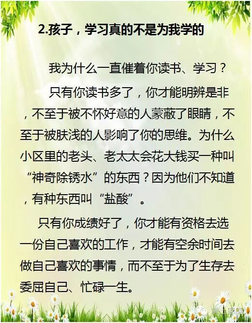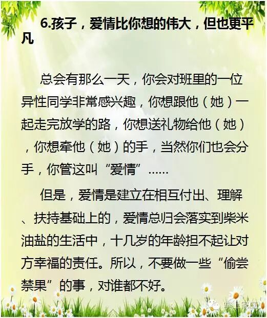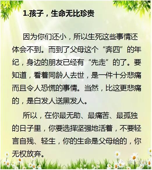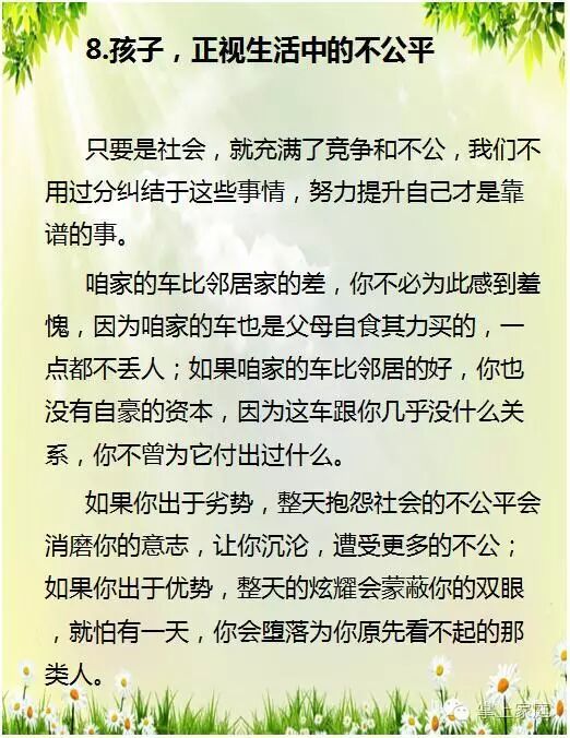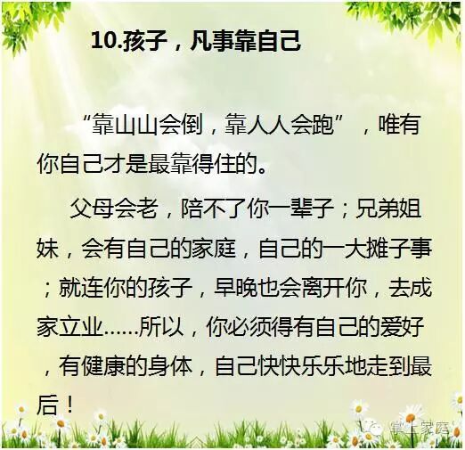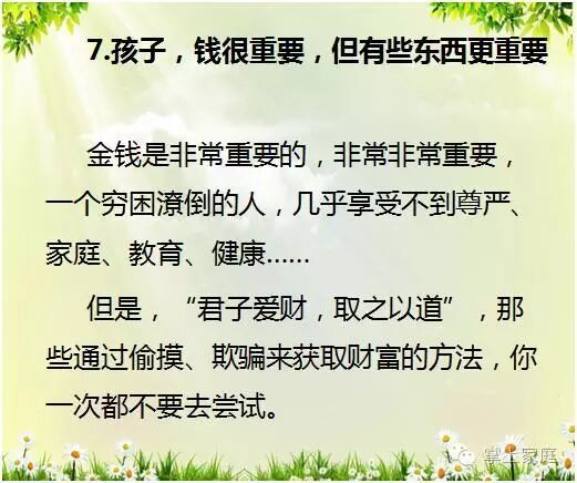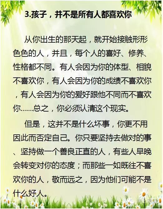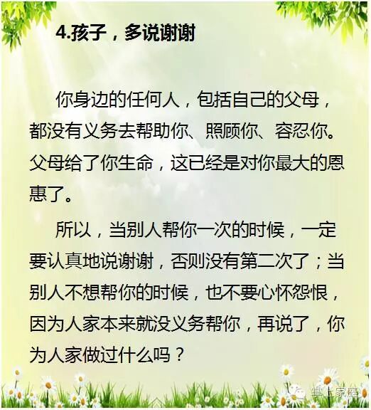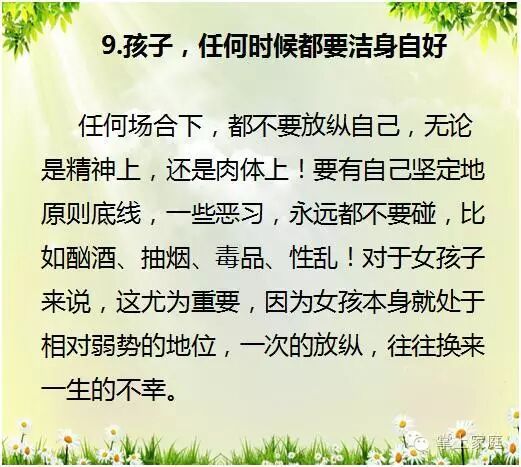 家庭教育对于一个人的成长和性格养成有着极大的影响,父母在孩子成长过程中扮演着非常关键的角色。孩子在对外部世界有所认识之始,会有意或无意对他人的行为进行模仿和学习,而父母作为孩子最亲近的人,则是孩子最初的模仿对象。 这十句话,在孩子14岁之前,请一定要告诉TA. | |