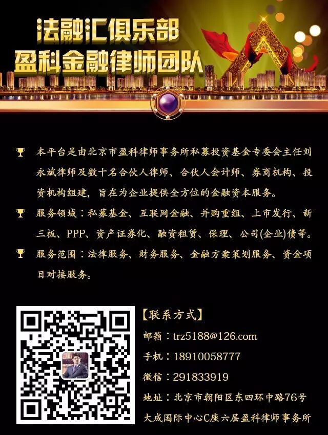 提供全国范围内的投资、融资、私募股权等金融及资本市场的相关服务:如会计、审计、法律、专业尽调、资源对接等。邮箱:trz5188@126.com 微信号:zibenquan888