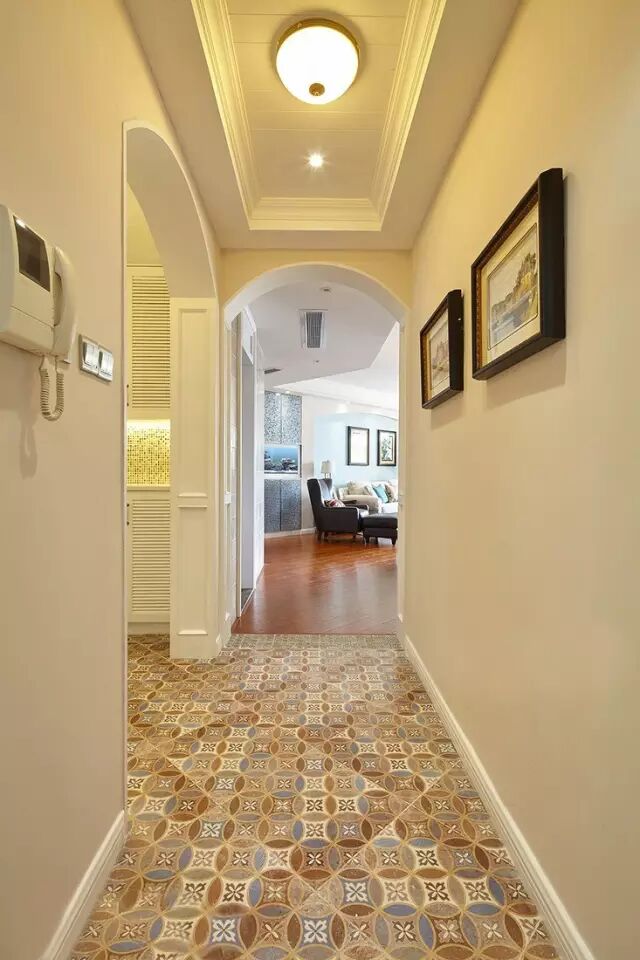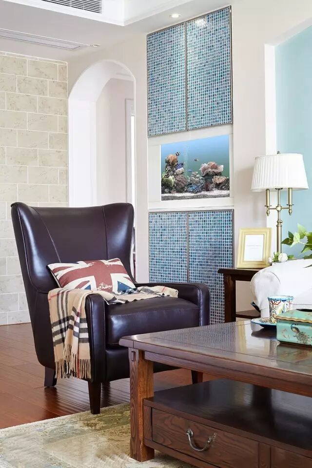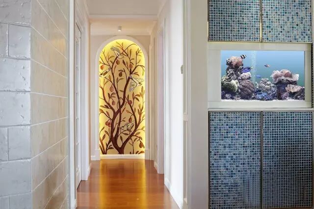这套房的格局有一点怪怪的,不知道当初建房的时候是怎么规划的,不过这样装修下来,看起来还挺顺眼的,很个性! ▲入户装铜钱样的地板,也有一定风水作用!望向客厅,不知道过道是斜的还是客厅是斜的! ▲冰蓝色做背景,搭配蓝色的窗帘,鱼缸所在位置代替了玄关的作用! ▲看到餐厅了吧,虽然让人傻傻的分不清到底哪里是正方位,但是整体看起来还挺顺眼的吧! ▲餐厅的设计很有品位的样子,卡座是当下很流行的餐厅设计手法! ▲餐厅被隔离成了单独的空间! ▲走廊尽头藏有灯带的拱门好似把人带入另外一个童话仙境的感觉。 ▲儿童房虽然不大,但是有床,有柜,有飘窗,有书桌! ▲阳台设计了休闲一角,合理的利用了阳台的特性。 | |