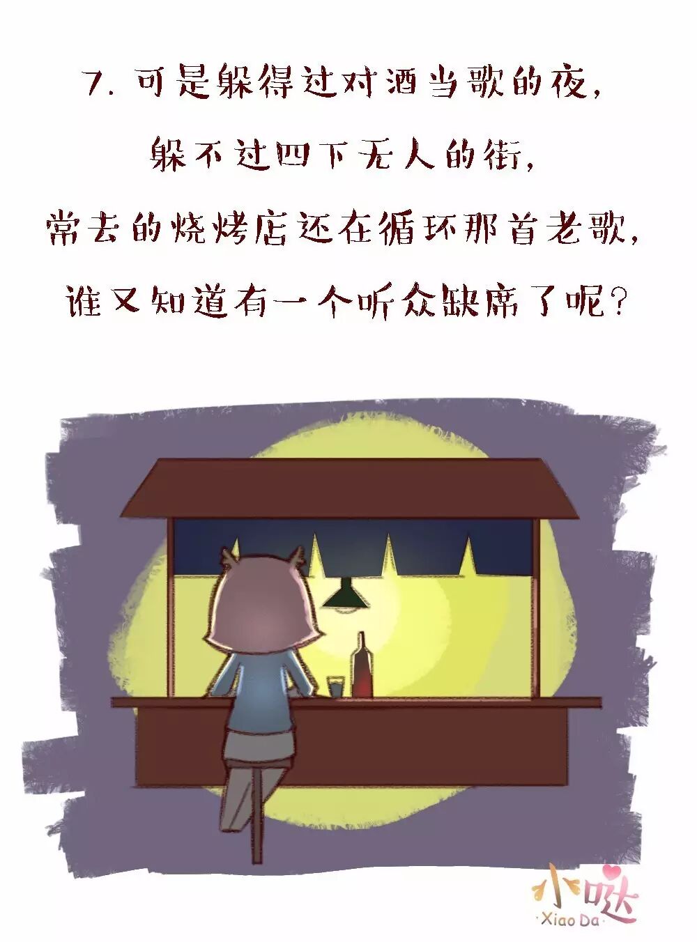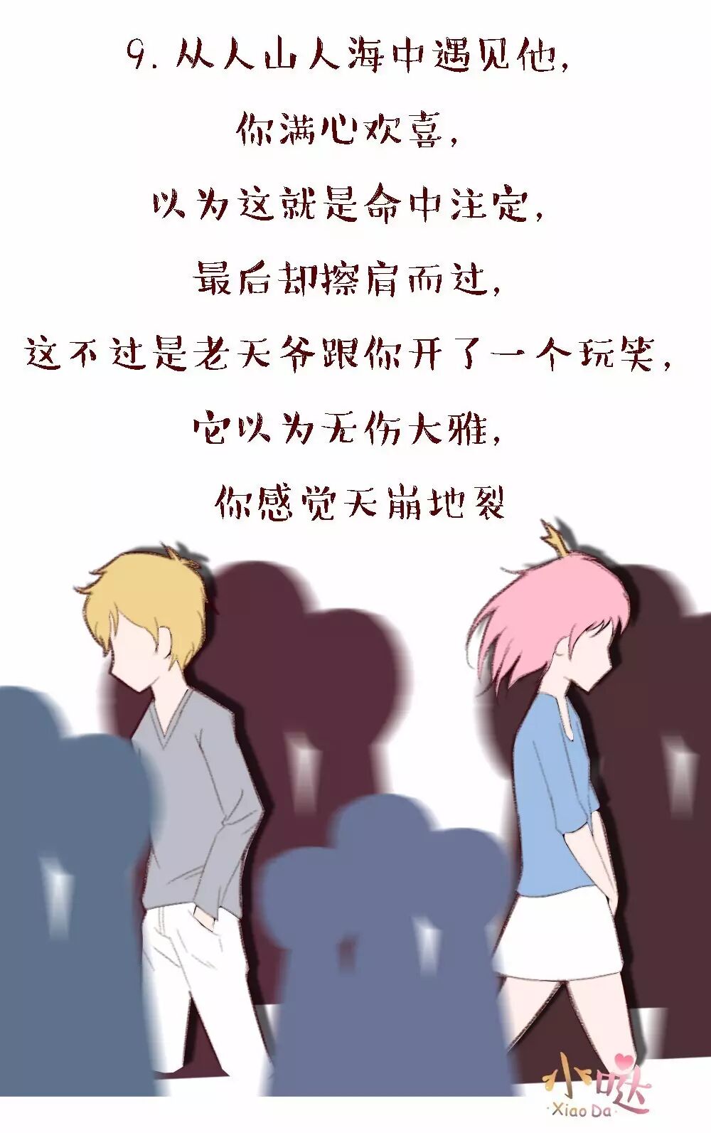 你记得他爱吃豆浆和油条 你记得他吃麻辣烫不喜欢放葱 你记得他喜欢听陈奕迅的歌 你记得他不喜欢阴天和雨天 你记得关于他的所有 可你和他已经分开很久了 每一秒世界上都有人在经历失恋 告别时都喜欢强装洒脱 告别后都在强忍想念 想念一个人的时候 我们都在画地为牢 把自己困在回忆里倔强地不肯出来 ——小哒 如今就有多么残忍 可是唯有和过去道别 你才能重获新生 愿有一天你和他在街边相遇 彼此点头微笑 轻轻问一句你还好吗 再无其他 | |