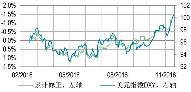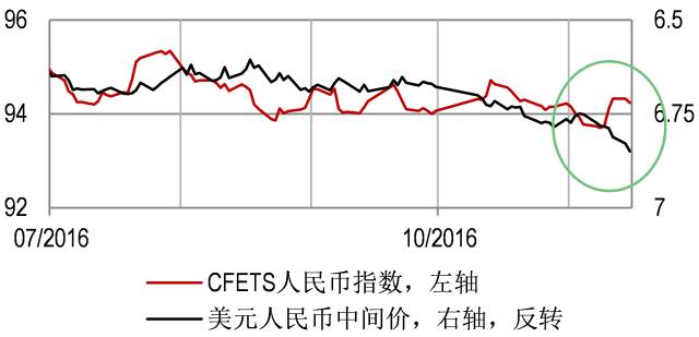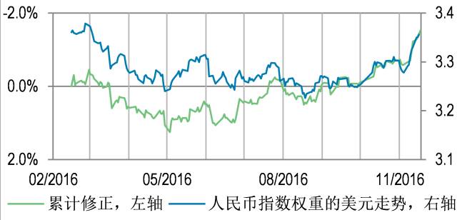 11月美国大选之后,人民币相对美元贬值很快,从11月3日的6.75贬值到11月17日的6.87,幅度达到1200点。但是,同期人民币指数却走势平稳,甚至回到94水平上方。为何CFETS人民币指数相对强势,而人民币对美元则相对弱势? 一种解释是:人民币虽然对美元贬值,但对其他货币升值。11月里,欧元、日元和马来西亚林吉特对人民币分别下跌2%、3%和2.4%。因此,尽管人民币对美元贬值将近2%,但由于欧元、日元和林吉特对人民币贬值较多,总权重也超过40%,抵消了人民币对美元贬值对人民币指数的影响。 另一种解释是,人民币指数最终的决定因素,只有两部分:一部分是日间价差,即前一天收盘价和前一天中间价的价差;一部分是修正,即不能用日间价差解释的人民币指数变动。修正的走势和美元走势高度相关。美元走强越多,负向修正越大(负向修正,指的是让人民币少贬值一些或者说升值一些,比如让原本是6.7的汇率变为6.6。) 今年上半年,美元指数走低,修正为正向,也就是使得人民币相对美元多贬值一些。如果修正的走势依照上述规律不断进行,那么就很难从修正走势上来解读修正意图(比如认为是帮助出口),因为无论正向修正还是负向修正,其结果无非是减少(但不是抵消)美元指数对于人民币对美元汇率的双向影响,其意义体现在波动幅度上,而并非方向上。 修正本身影响人民币指数,当美元走强时,修正为负使得人民币少贬值一些,这使得人民币指数比没有负向修正的时候要高一些,虽然在这个时候人民币兑美元是贬值的。甚至,美元走强越多,负向修正越大,反而会导致人民币指数走高更多。11月10日的情况就是如此,当天人民币指数从前一天的93.75走高至94.10,主要原因就是强势美元导致的强烈负向修正,支持了人民币指数飙升。 在人民币贬值预期强烈的时候,美元走强会影响日间价差的幅度。我们可以想象,如果人民币贬值压力很大,而美元稳定不动,那么人民币贬值就主要体现为大幅连续的正日间价差(收盘价高于中间价),对人民币指数造成大幅连续的削弱,导致人民币指数不断走低。但若美元走强,人民币贬值压力主要通过美元走强的渠道实现,导致日间价差较小。 如果美元走强时美元兑人民币的走势,和美元稳定时美元兑人民币的走势相同,由于前者日间价差小,后者日间价差大,因而人民币指数虽然也会因此有连续走低的压力,但幅度会小。而较小的幅度,在目前的情况下,就让负向修正给人民币指数带来的支持得以彰显。 例如,11月美元剧烈走强,负向修正很大,为人民币指数带来支撑;日间价差虽然削弱人民币指数,但幅度不大,基本被修正所抵消,最终人民币指数几乎没有变化。 但在6月,美元指数在月初和月末水平相近,因此修正很小,而日间价差非常大,导致人民币指数下跌剧烈。 甚至,在11月18日,我们看到17日中间价差几乎为零,而18日修正大幅向下,导致人民币指数蹿升。 对于美元兑人民币,今年前些时候美元的疲软对人民币的支持已经荡然无存,甚至开始加剧人民币对美元贬值。目前支持人民币的因素乃是修正,但修正只是部分减弱美元走强的影响,而不能抵消。日间价差相对有限,中间价走高主要因强势美元得到体现。 对于人民币指数,如果美元继续走强,则人民币指数受到小价差和大修正的影响,可以稳定在94上方;而一旦美元停止上升,价差开始变大,修正无从产生,则人民币指数将重新开始走低。如果美元出现回调,尽管人民币可能相对美元走强,但日间价差会更大;而负向修正变为正向,将和日间价差一起削弱人民币指数,人民币指数会加速下跌。 | |